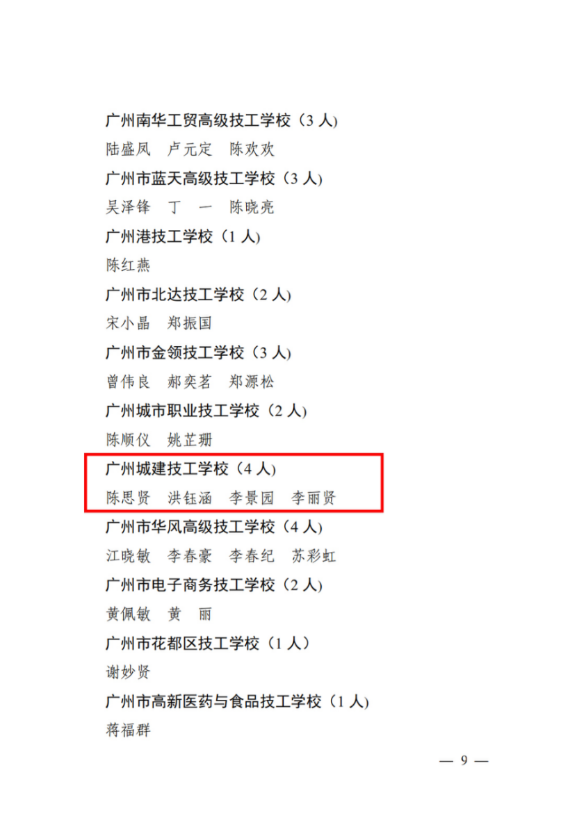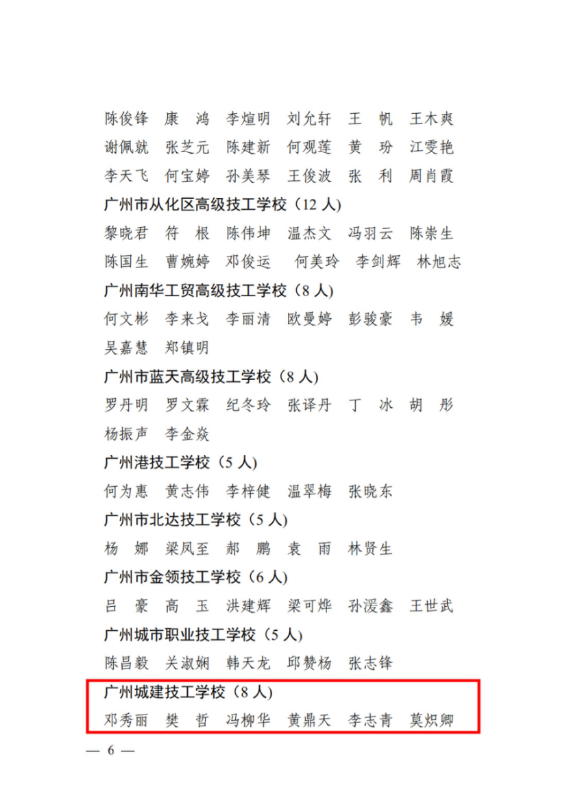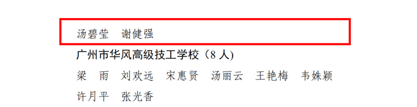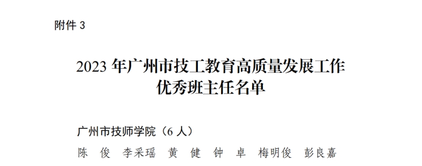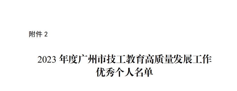 近日,广州市人力资源和社会保障局发文《广州市人力资源和社会保障局关于2023年广州市技工教育高质量发展工作优秀单位与优秀个人的通报》,我校邓秀丽、樊哲、冯柳华、黄鼎天、李志青、莫炽卿、汤碧莹、谢健强8名教师荣获2023年广州市技工教育高质量发展工作“优秀个人”荣誉称号;陈思贤、洪钰涵、李景园、李丽贤4名教师荣获2023年广州市技工教育高质量发展工作“优秀班主任”荣誉称号。