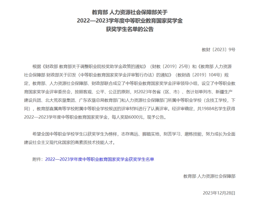 近日,教育部、人力资源和社会保障部公布了《2022-2023学年度中等职业教育国家奖学金获奖学生名单》,我校学子殷依飞、林文涛、谢俊腾、郑国旺、朱云飞荣获2022—2023学年度中等职业教育国家奖学金,每人获得国家奖励6000元。