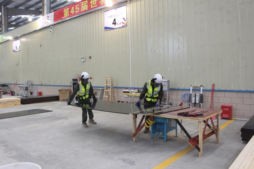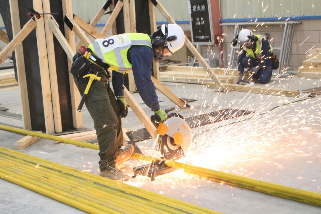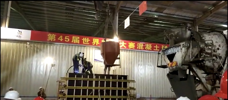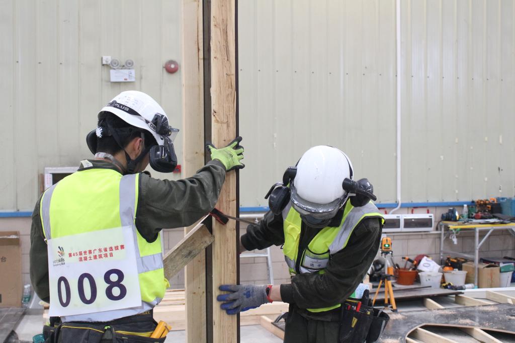 混凝土建筑项目广东省选拔赛按照世界技能大赛的高要求、高标准实施,选手需要完成“工作组织和管理能力”“沟通和人际交往能力”“图纸识读”“施工放线”“模板设计与安装”“混凝土浇筑与修复”“拆模及养护”等七个模块,竞赛时长达27小时,是对选手组织工作、技术沟通等综合能力的全面考核。