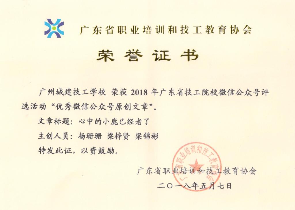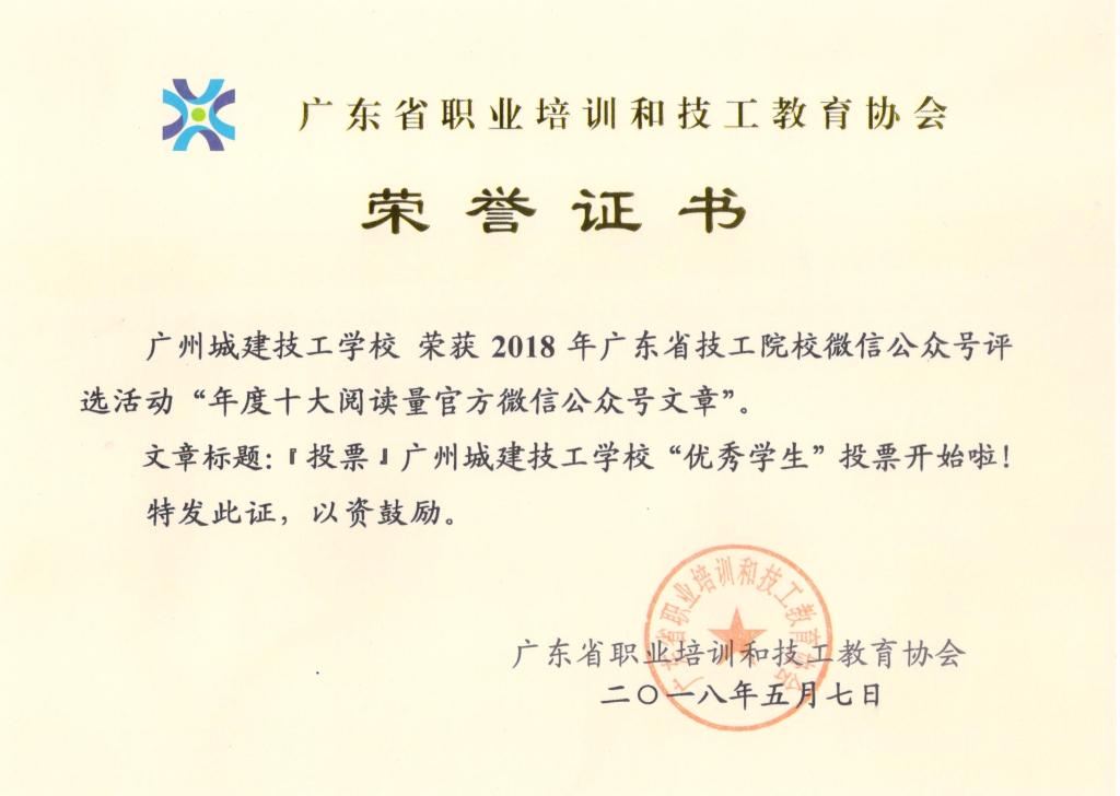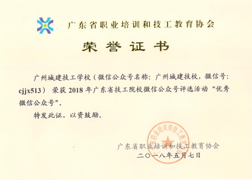 本次评选活动历时2个月,共收到53所学校报送的66个微信公众号与132篇微信公众号文章。经对微信公众号的运营数据抓取,产生了微信公众号入围年度十大影响力官方微信公众号、年度十大阅读量官方微信公众号文章;经专家评审,共评选出优秀微信公众号40个,微信公众号原创文章50篇。其中,学校官方微信(微信号:cjjx513)被评为“优秀微信公众号”,《『投票』广州城建技工学校“优秀学生”投票开始啦!》被评为“年度十大阅读量官方微信公众号文章”,《心中的小鹿已经老了》被评为“优秀微信公众号原创文章”。同时,学校办公室刘振兴主任被评为“优秀通讯员”。