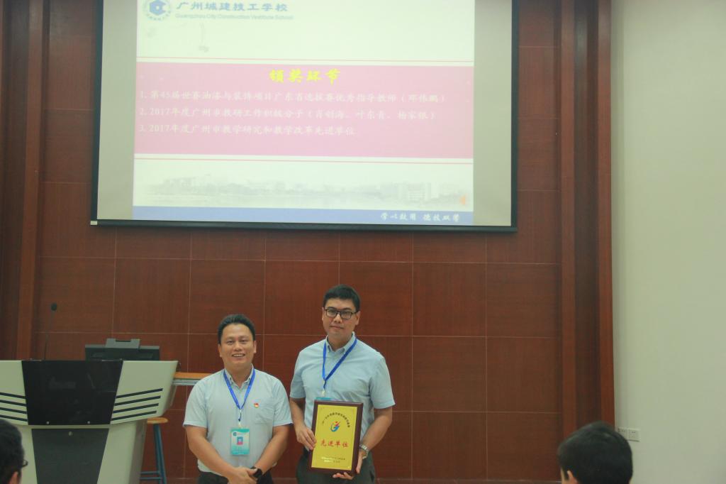 会上,表彰了第45届世赛油漆与装饰项目广东省选拔赛优秀指导教师、2017年度广州市教研工作积极分子、2017年度广州市教学研究和教学改革先进单位,校领导依次上台为获奖单位和获奖个人颁发荣誉证书。