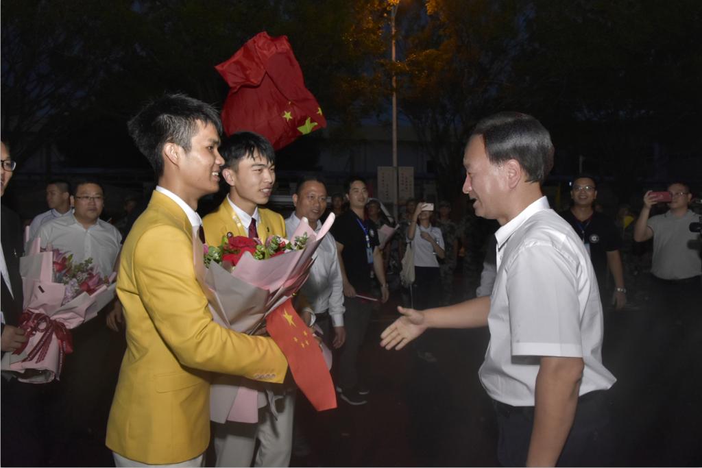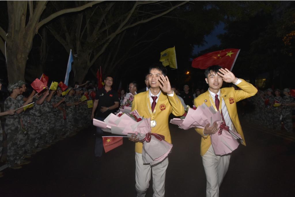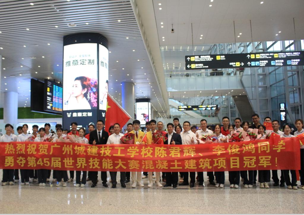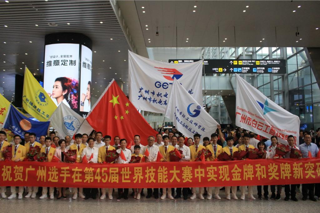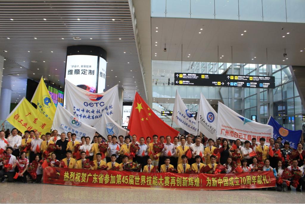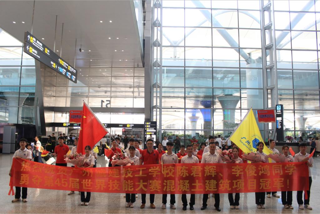 2019年8月29日下午,第45届世界技能大赛广东省、广州市参赛团载誉返穗,广东省及广州市政府领导,广东省人社厅、广州市人社局有关负责人在现场迎接并表达了祝贺,对广东省代表团的团结奋斗和顽强拼搏给予肯定和表扬。与此同时,学校校长叶忠率队齐聚机场迎接我校第45届世界技能大赛混凝土建筑项目冠军陈君辉、李俊鸿及教练李修波凯旋而归。两位冠军和教练一出站,就被掌声、鲜花、闪光灯和师生们簇拥,教师代表和学生代表拉起横幅,高举校旗,热情地与他们合影,共同分享成功的喜悦。