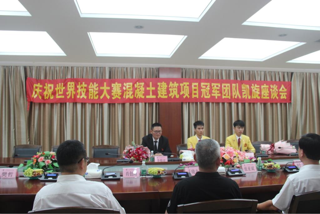 随后,学校召开庆祝陈君辉、李俊鸿同学获世界技能大赛冠军座谈会。会上,校务管理委员会主任张亚斌博士代表学校全体员工、代表城建园区的2万多名师生员工欢迎君辉和俊鸿带着对国家的贡献、对城建技校及个人的巨大的荣誉顺利凯旋。张主任对选手、教练的辛勤付出表示感谢、祝贺,他指出辛苦和努力是有回报的,荣誉是靠努力奋斗得来的,今天取得的胜利是两年多付出的成果,也证明了我们的工作是有效的、出色的,为以后的发展赢得了无限的机会。同时,张主任还强调成绩来之不易,机会是创造出来的,这个特大的喜讯鼓舞着全校师生继续努力拼搏、赶紧奋斗、赶紧争取,他再次感谢选手们为校争光,感谢他们对学校、对技工教育、职业教育做出重大的贡献,希望全体教职员工向他们学习、向他们致敬。叶忠校长为学校的选手、教练团队感到骄傲和自豪。两位冠军选手感谢学校为自己提供这么重要的平台,感谢学校老师和教练对自己的栽培之恩。李修波教练则感谢城建园区、学校领导对他的支持和信任,并会一如既往的做好本职工作。