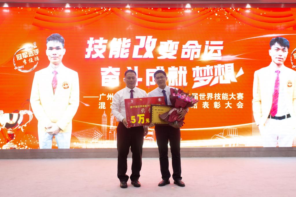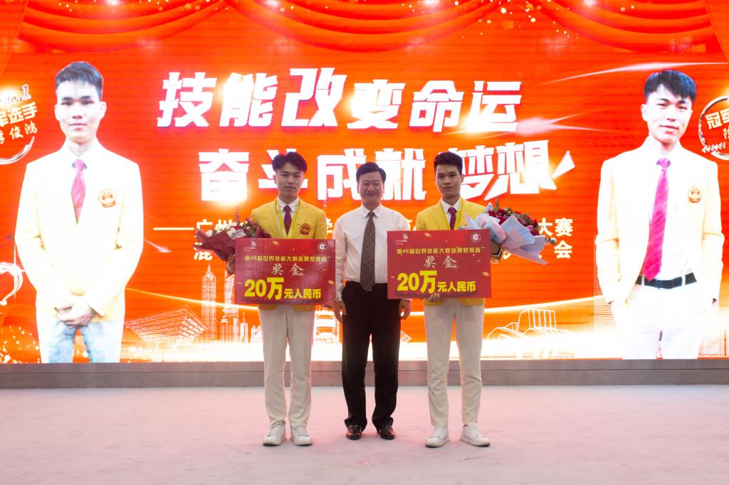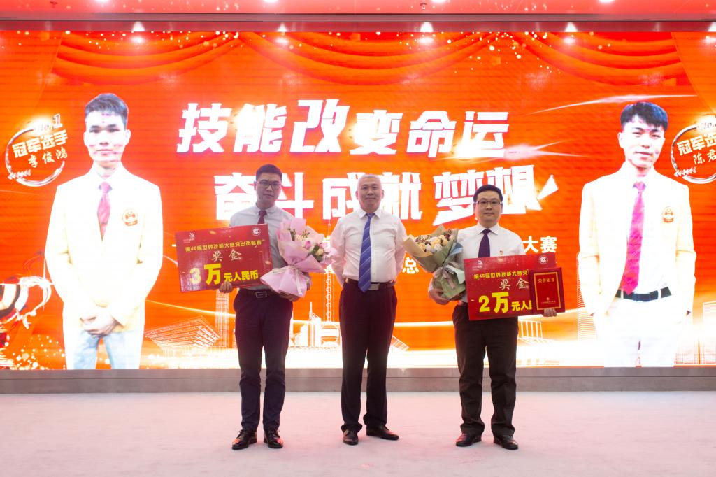 校管会主任张亚斌为世赛冠军得主陈君辉、李俊鸿颁发20万元人民币的奖励
