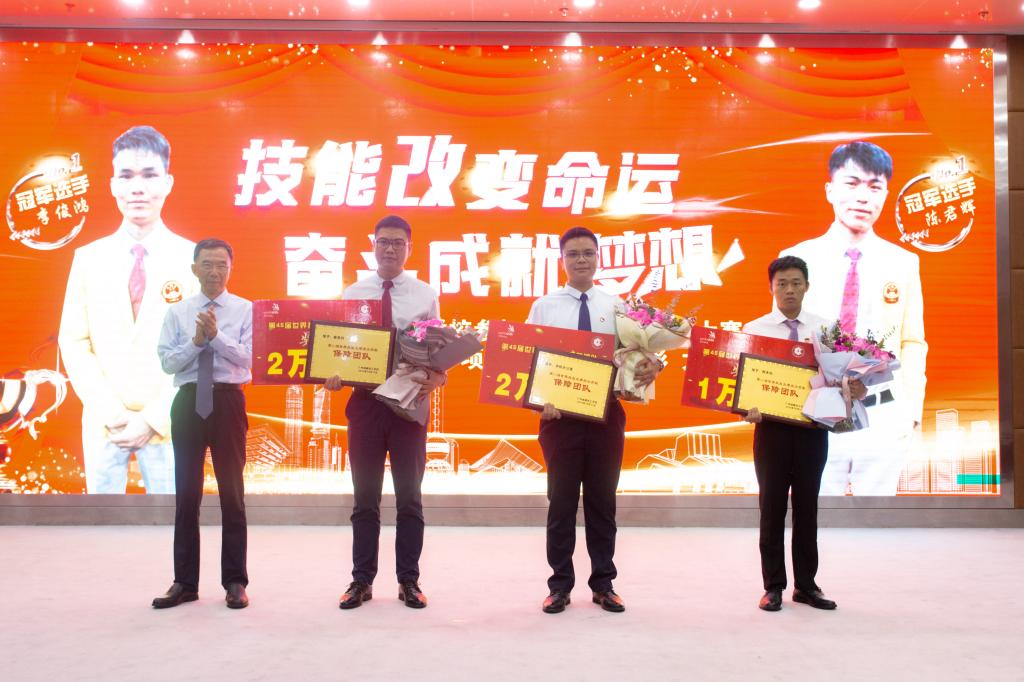 会上,学校党总支书记、副校长林勇刚宣读表彰文件《关于表彰参加第45届世界技能大赛做出突出贡献的集体及个人的决定》。公司领导、学校领导依次对第45届世界技能大赛混凝土建筑项目冠军陈君辉、李俊鸿,教练李修波以及对本次比赛做出突出贡献的集体及个人进行颁奖。