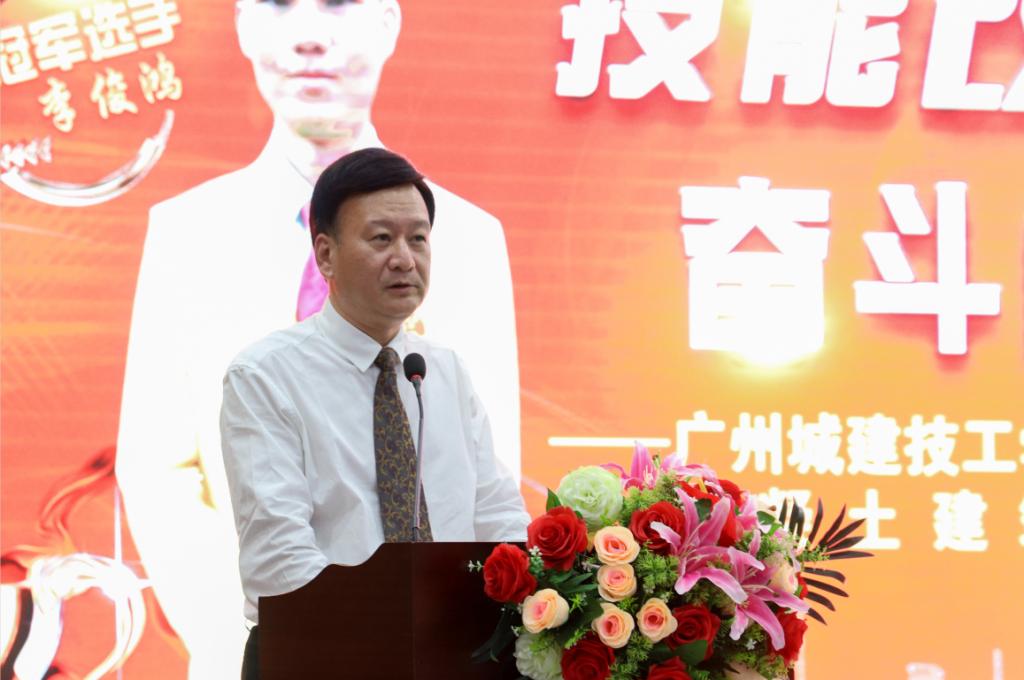 会上,广州城建职业学院校长蒋新华发表讲话。蒋校长代表城建学院两万多名师生员工向两位冠军选手、冠军教练团队表示祝贺,他希望广大学子要学习两位冠军善于思考、敢于创新、吃苦耐劳、拼搏进取的精神,志存高远、脚踏实地,努力成为适应国家和社会发展需要的技术技能型人才。他希望教师要坚持立德树人,既重知识传授,更重学生价值观塑造和人格养成,培养学生的优良品质和团队协作意识;要懂得用“两面镜子”,用“放大镜”去发现学生身上的闪光点,用“显微镜”去挖掘学生身上的潜能,坚持有教无类、因材施教,让学生的个性得到充分发展;要不断提高自己,给学生“一杯水”,自己就要有“一桶源源不断的活水”。他希望管理干部要有大局意识,以更高的站位、更宽的视野发现人才、培养人才、使用人才;要勇于担当、敢于作为,以爱岗敬业、无私奉献的工作热忱做好本职工作。