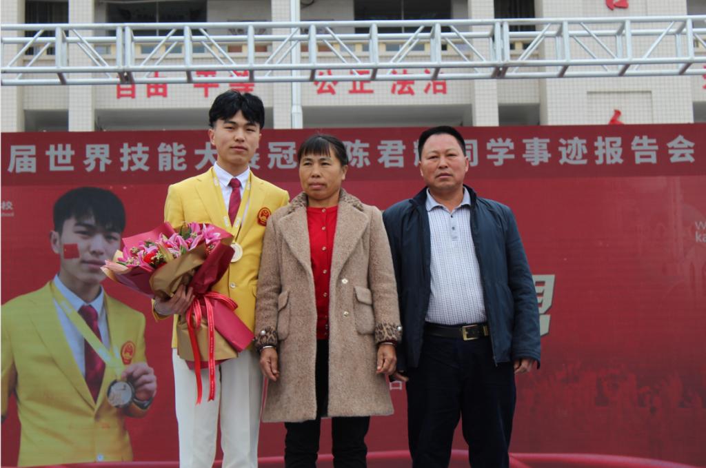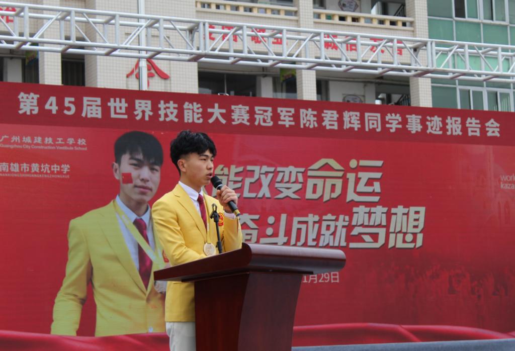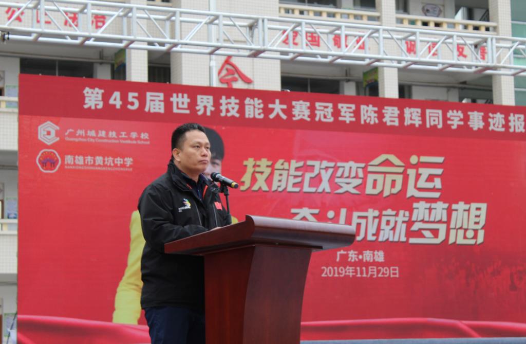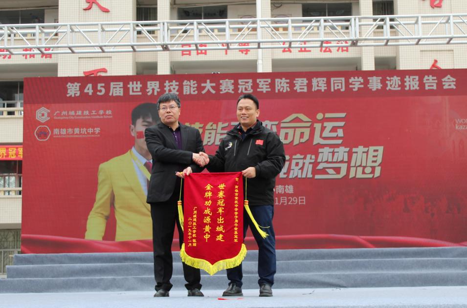 2019年11月29日上午,第45届世界技能大赛混凝土建筑项目冠军陈君辉同学在我校叶忠校长等校领导及教练李修波老师的带领下回到母校南雄市黄坑中学作先进事迹报告。受到南雄市政府、南雄市黄坑中学校长陈盛荣等领导的热情接待。南雄市黄坑中学共2000多名师弟师妹参加了本次报告会。