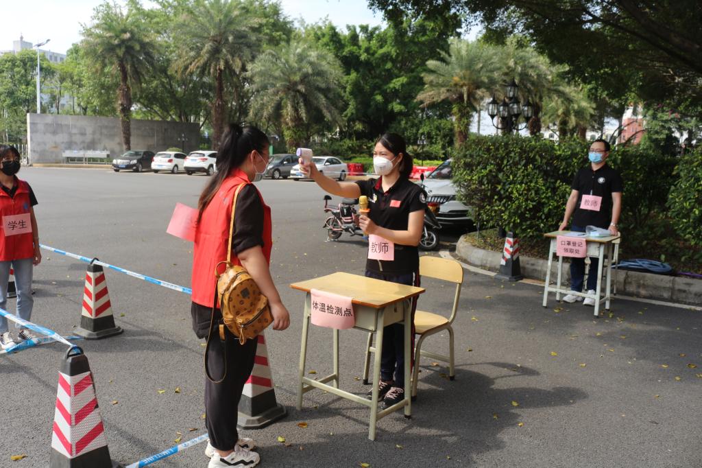 4月30日,开学第一天,上午九时,18级学生正在返校检测。学生在工作人员的统一指挥下,彼此间隔一米,在校门外有序排队,等待通过健康检测。3名同学间隔1米排好队,首先进入消毒区消毒行李,再到测温区测量体温,额温36.8度以下方可进入校园。高于36.8度进入复测区复测体温,复测异常进入留观转诊点,对体温异常学生启动应急处置预案,逐级上报;体温正常学生进入验证区验证健康码并指引扫码登记信息。