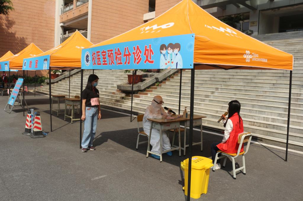 学生间隔1米,有序排队健康检测