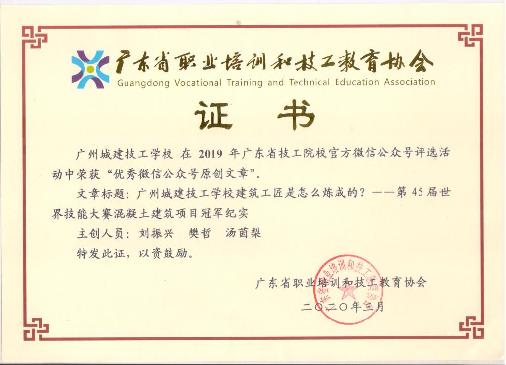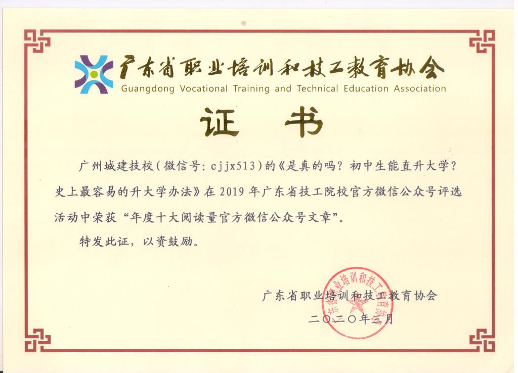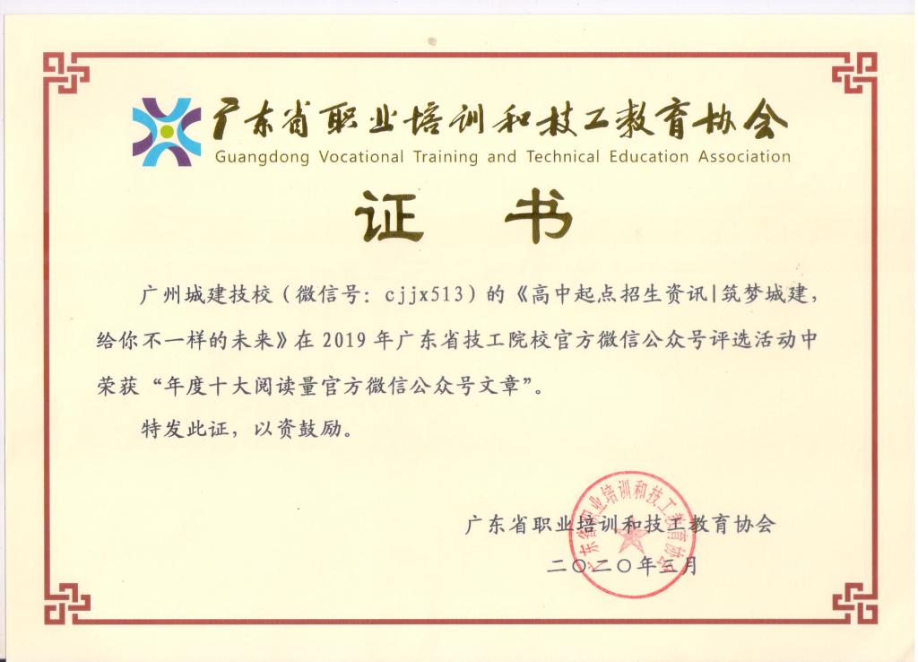 其中,学校官方微信(微信号:cjjx513)被评为“优秀微信公众号”;《高中起点招生资讯|筑梦城建,给你不一样的未来》《是真的吗?初中生能直升大学?史上最容易的升大学办法》被评为“年度十大阅读量官方微信公众号文章”;《广州城建技工学校建筑工匠是怎么炼成的?——第45届世界技能大赛混凝土建筑项目冠军纪实》被评为“优秀微信公众号原创文章”。