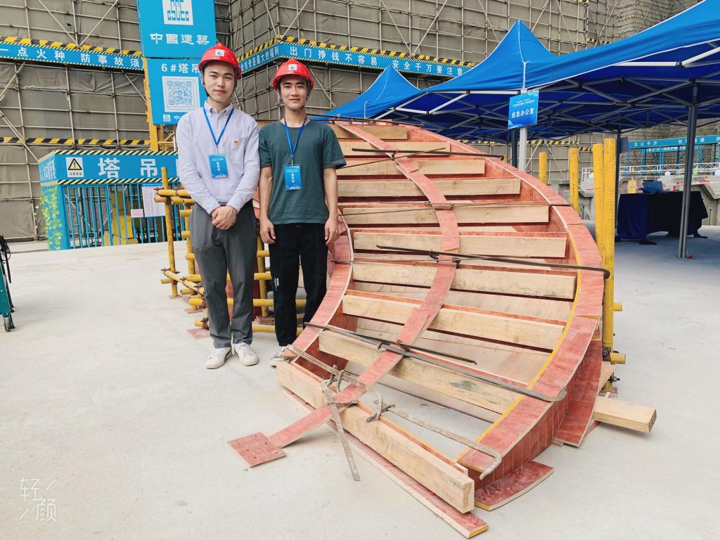 作为现场展示项目,陈君辉老师带领学校2019级建筑施工班学生黄卓丰制作了模板工比赛试题“旋转楼梯”。