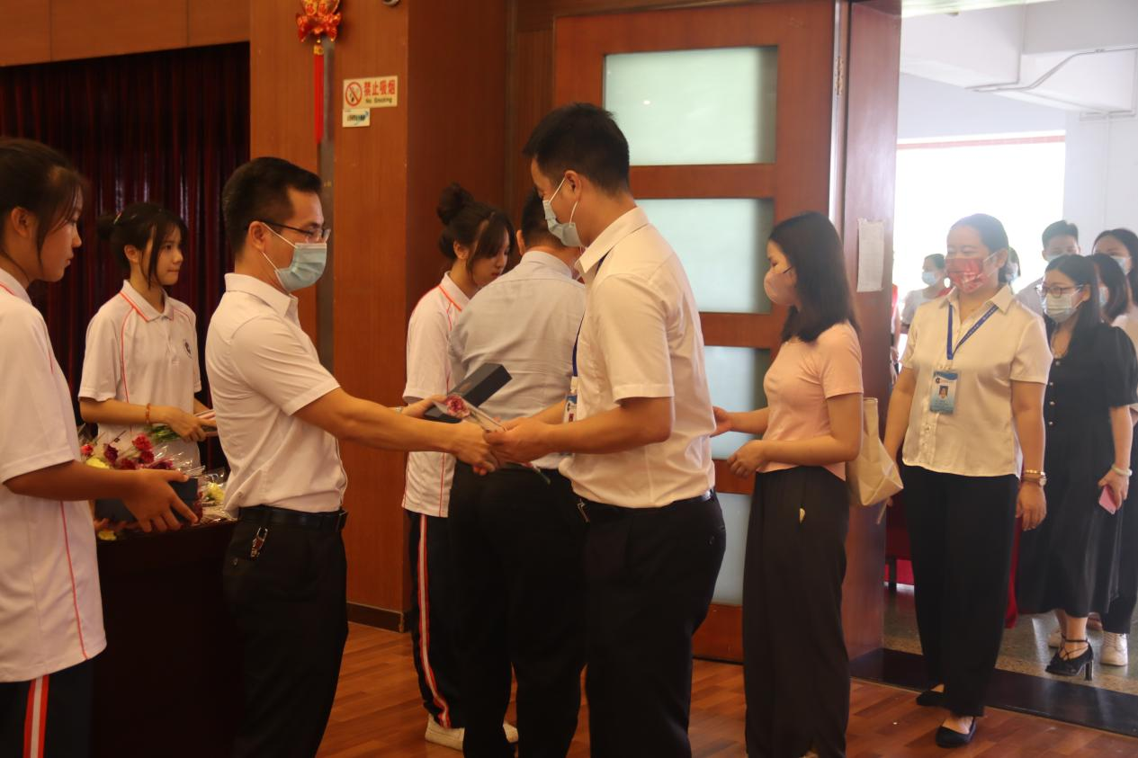 会议开始前,叶忠校长、林勇刚书记分别为全体教职员工派发教师节鲜花和礼品,并逐一和老师们亲切握手,送上教师节祝福。