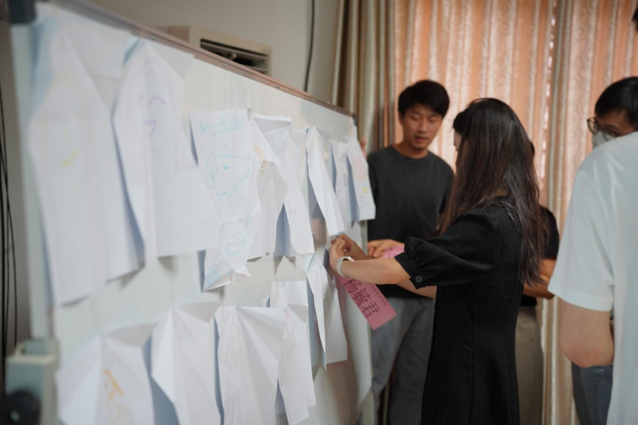 开班仪式中,邓副主任还现场组织了“破冰环节”。老师们完成自画像后,把自画像折成飞机投出。捡到飞机的老师,通过画像及文字描述找到画像主人后,把画像粘贴在白板上并把姓名牌给到对方,同时向大家介绍对方,合影留念。