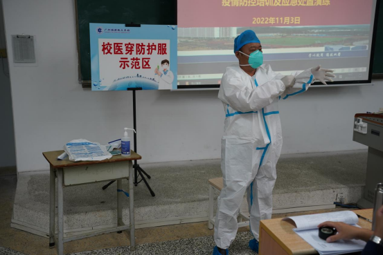 演练过程中,学校校医详细讲解了用物准备、正确手部卫生消毒,隔离衣、防护服穿脱步骤、防护及消毒处理步骤等具体细节,随后现场详细演示了穿脱防护服的分解步骤及注意事项。