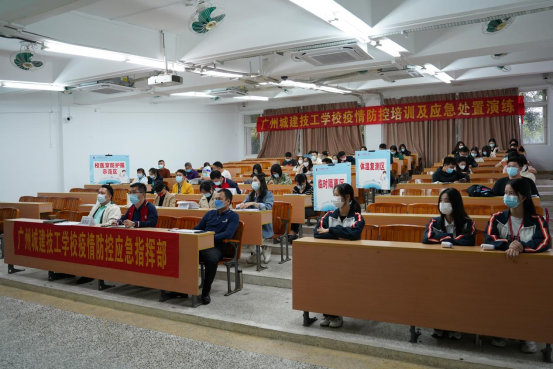 演练开始前,学校办公室主任王江洪进行了新冠疫情防控培训。王主任根据《广州市从化区新型冠状病毒肺炎疫情防控指挥部办公室教育疫情防控工作专班转发关于印发近期大中专院校疫情防控工作指引》文件,从“实施封闭管理”“加强人员出入管理”“做好监测预警”“做好重点人员健康管理”“开展核酸抽检”“加强聚集性活动管理”等十二个方面进行详细的疫情防控培训。