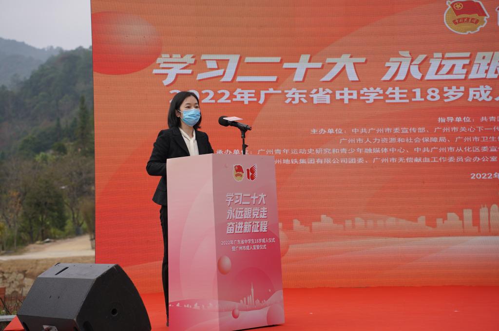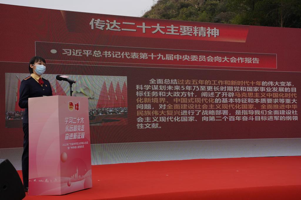 本次活动主题为学习二十大、永远跟党走、奋进新征程,共设有10项流程。在庄严肃穆的升国旗仪式后,党的二十大代表、广州地铁运营总部高级客车司机李方方进行了二十大精神宣讲,带领18岁青年学习党的二十大精神。李方方同志从亲历党的二十大感受出发,传达了党的二十大主要精神。