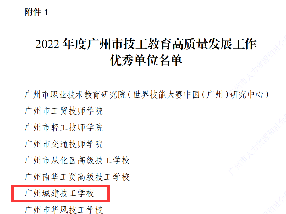 2023年1月18日,广州市人力资源和社会保障局传来佳音,根据《广州市人力资源和社会保障局关于2022年广州市技工教育高质量发展工作优秀单位与优秀个人的通报(穗人社通报〔2023〕1号)》文件,学校获评2022年度广州市技工教育高质量发展工作优秀单位。
