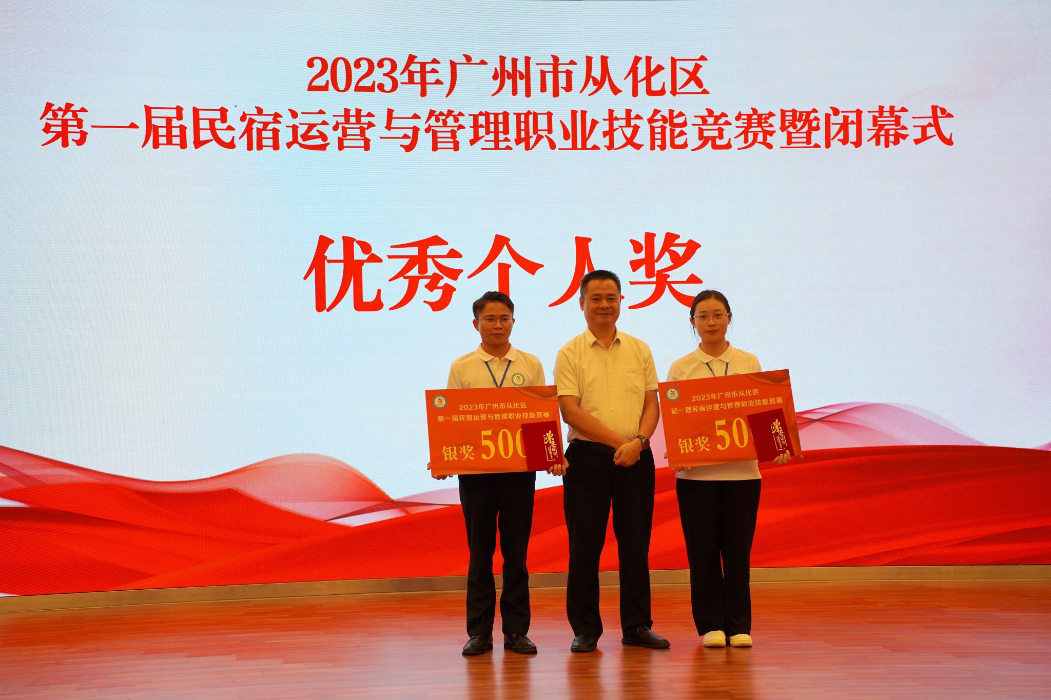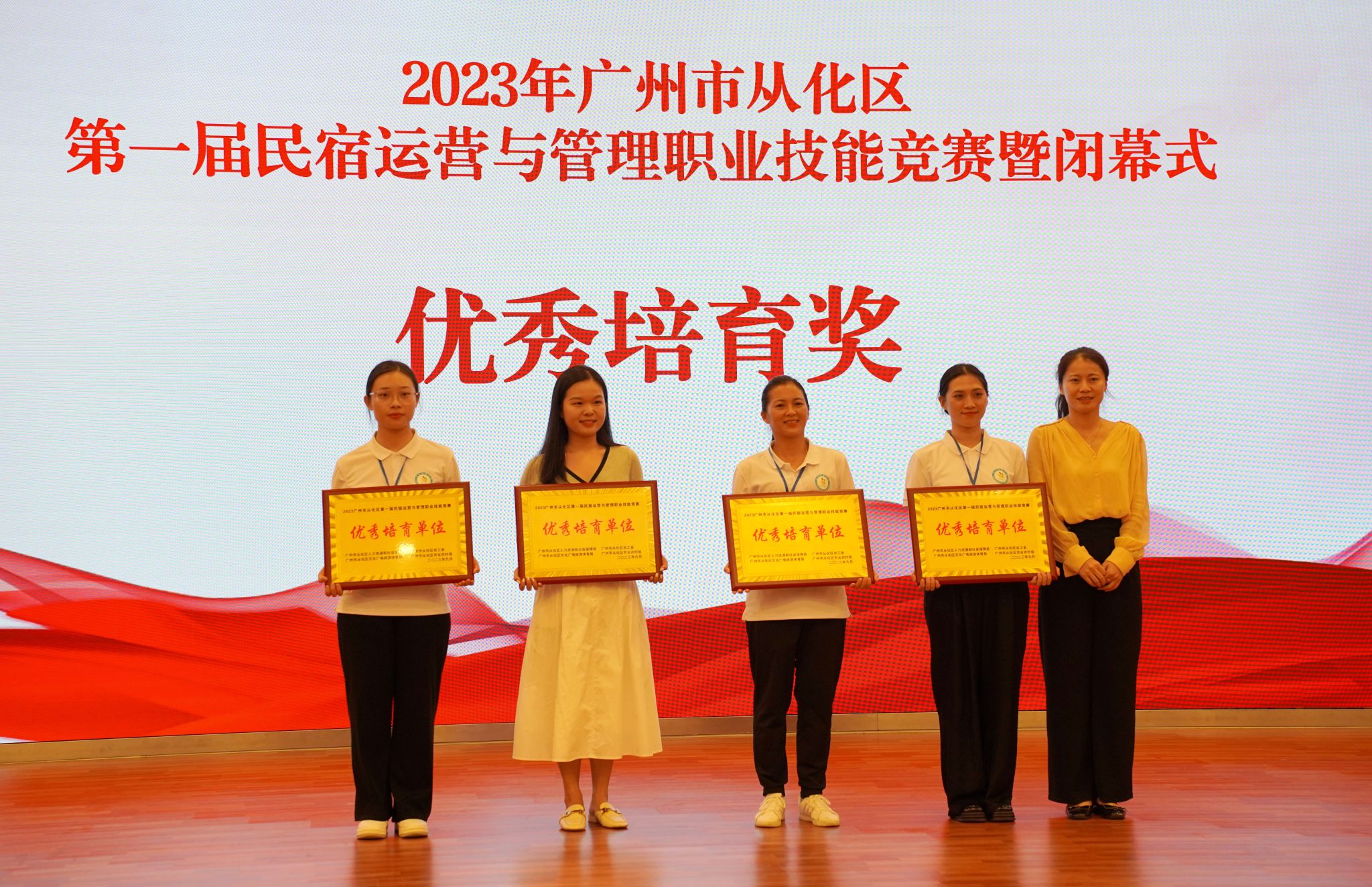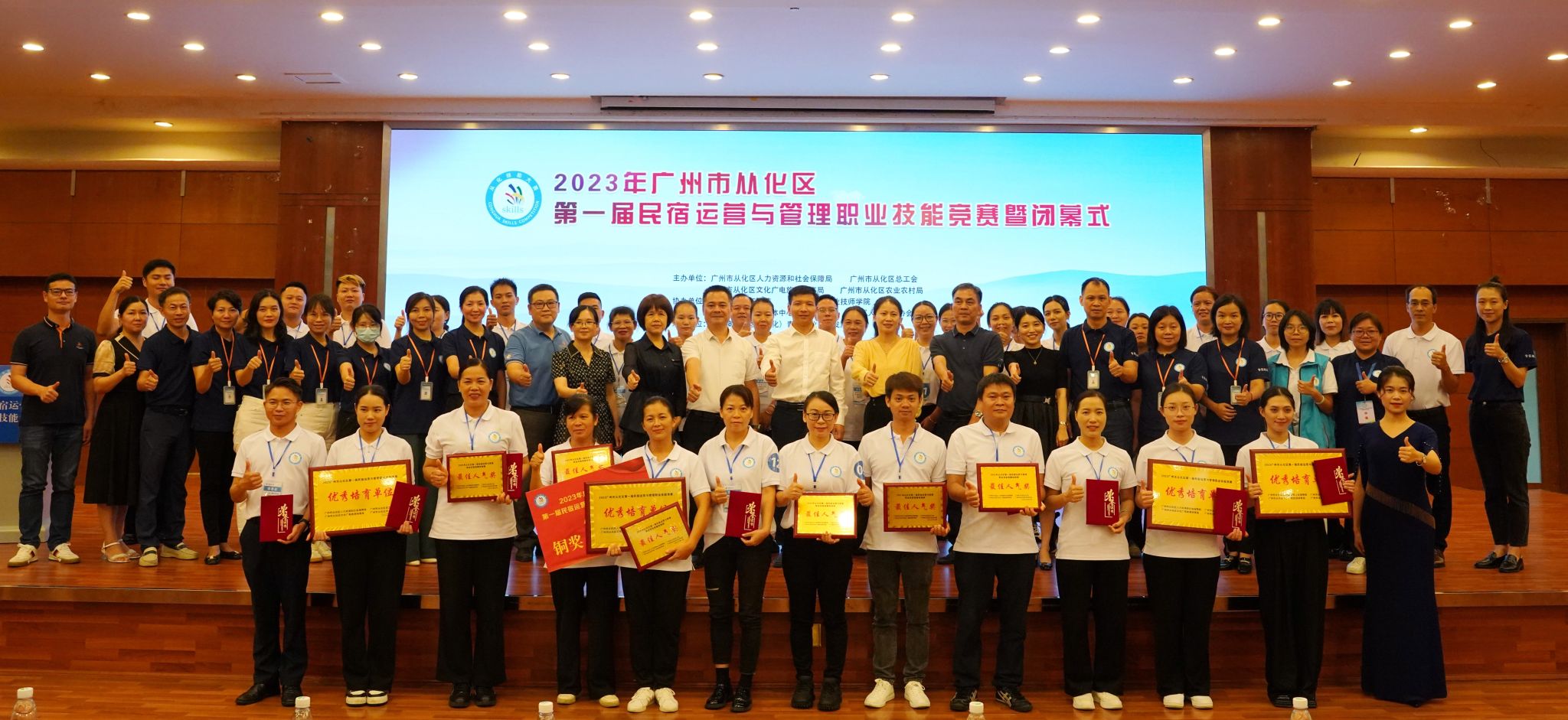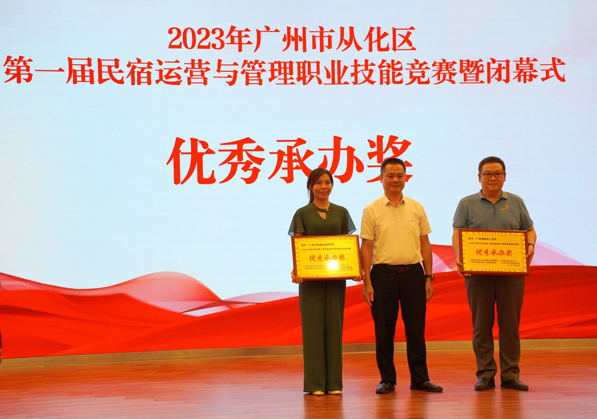 2023年9月13日下午,由广州市从化区人力资源和社会保障局、广州市从化区总工会、广州市从化区文化广电旅游体育局、广州市从化区农业农村局主办,广州城建技工学校、广州市公用事业技师学院、广州市从化区融媒体中心、广州市从化区各镇(街)、流溪人家民宿协会协办,粤港澳大湾区 (从化) 青年职业能力发展中心承办的首届民宿运营与管理职业技能竞赛在学校人文艺术楼四楼报告厅胜利闭幕,并举行了颁奖仪式。