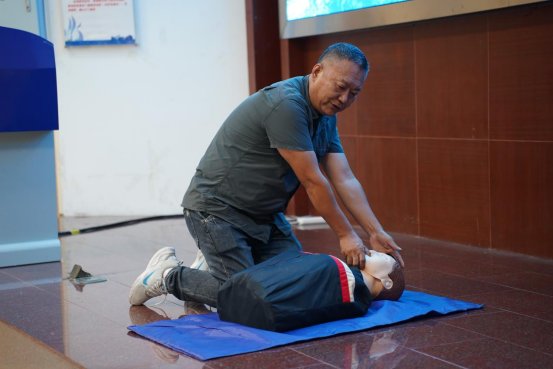 在实践操作演示部分,培训内容主要包括外伤包扎、心肺复苏等项目。培训中,储医生讲解了现场急救、心肺复苏、伤员处置等基本理论知识,应用“模拟人”教具进行了完整的现场急救示范。