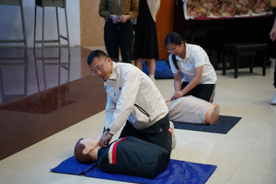 老师们认真向储医生学习急救技能和操作要领后,大家在现场开展了心肺复苏等急救技术的实操练习。通过实操练习,参训老师们进一步掌握了应急救护基本知识及急救操作技能。