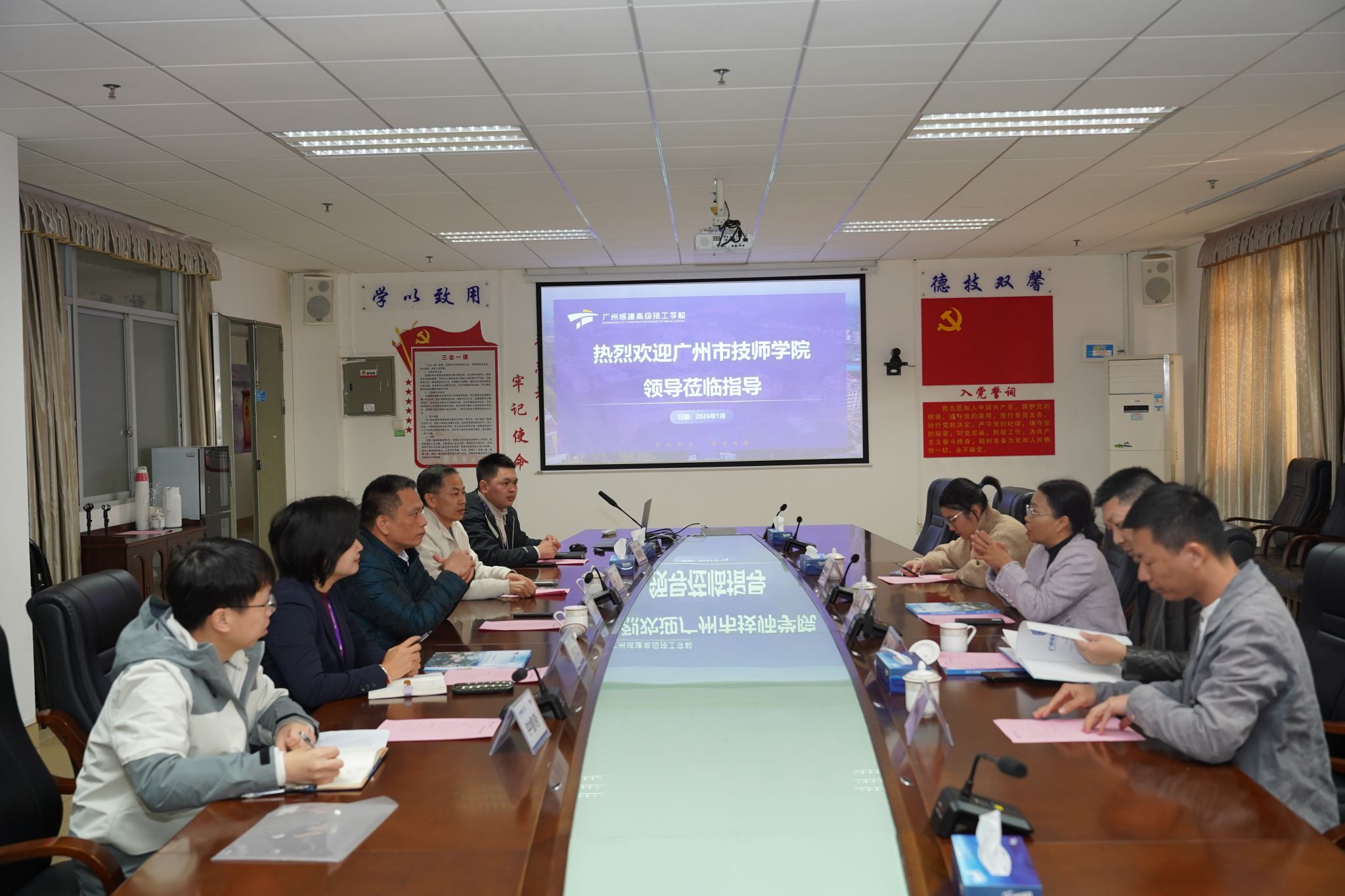 2026年1月5日下午,广州市技师学院陈凤贞副院长一行6人莅临我校交流技能鉴定和职业培训工作,并作广州市民政局项目相关专题调研。我校党委书记、校长叶忠,副校长计林,校企合作与对外交流部副主任陈燕加,校企合作与对外交流部干事钟睿晓、杨育君一同在行政楼408会议室接待了来宾。