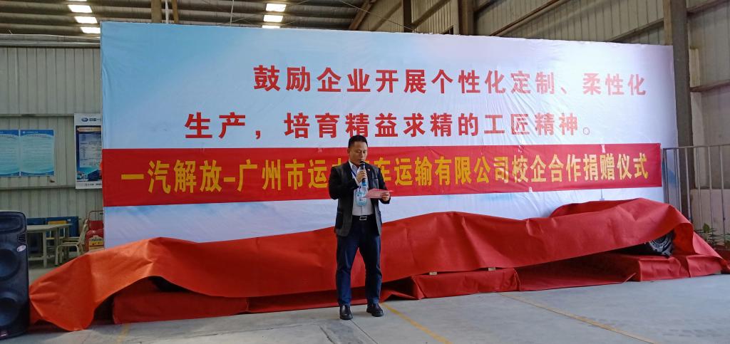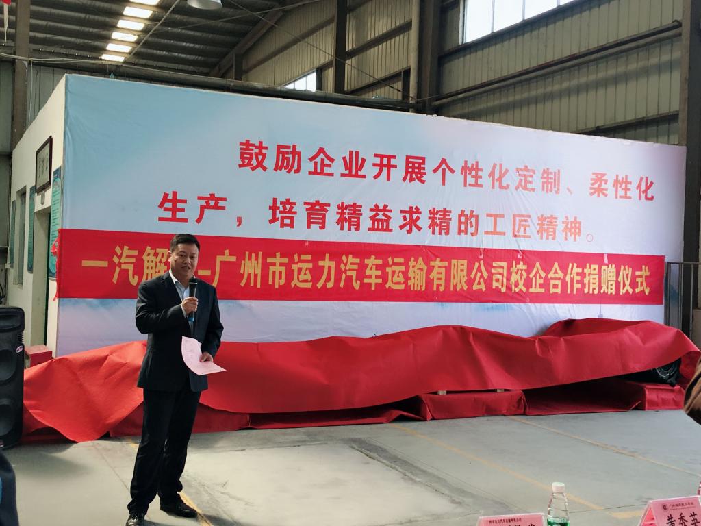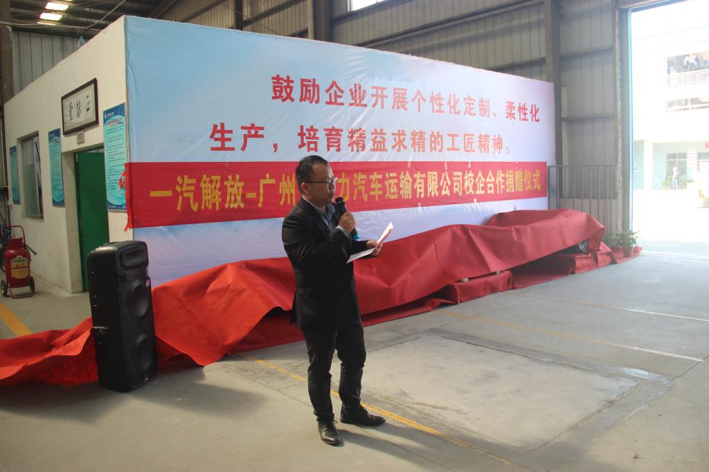 2018年11月22日,学校与一汽解放-广州市运力汽车运输有限公司教学设备捐赠仪式在学校公共实训中心隆重举行。一汽解放汽车销售有限公司粤海商代处总经理张思军、服务经理宿伟国,广州市运力汽车运输有限公司总经理李博艺、副总经理程东亮、办公室主任黄耀武,学校校长叶忠、副校长计林、校企合作办主任余立棋、相关教师及汽修专业学生出席了本次仪式。仪式由余立棋主任主持。