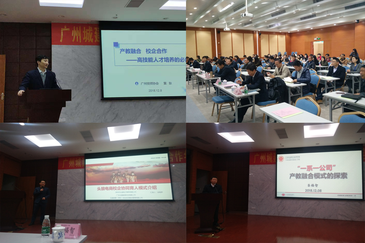 广州市技师协会常务副会长黄耿、广东岭南现代高级技工学校副校长吕福智、深圳市头狼电子商务有限公司总经理肖鸣声,分别作“产教融合、校企合作-高技能人才培养的必要性”、“一系一公司产教融合模式的探索”、“电子商务专业校企协同育人模式介绍”的主题报告。