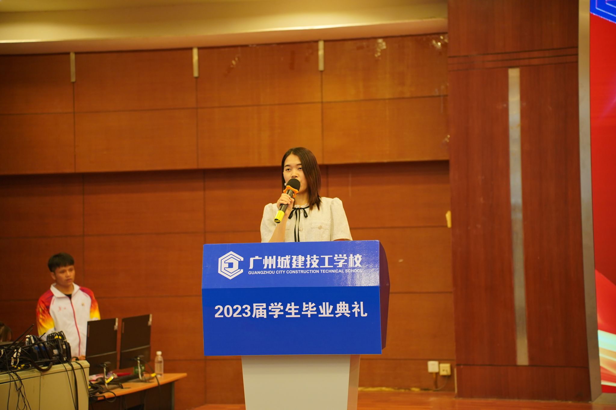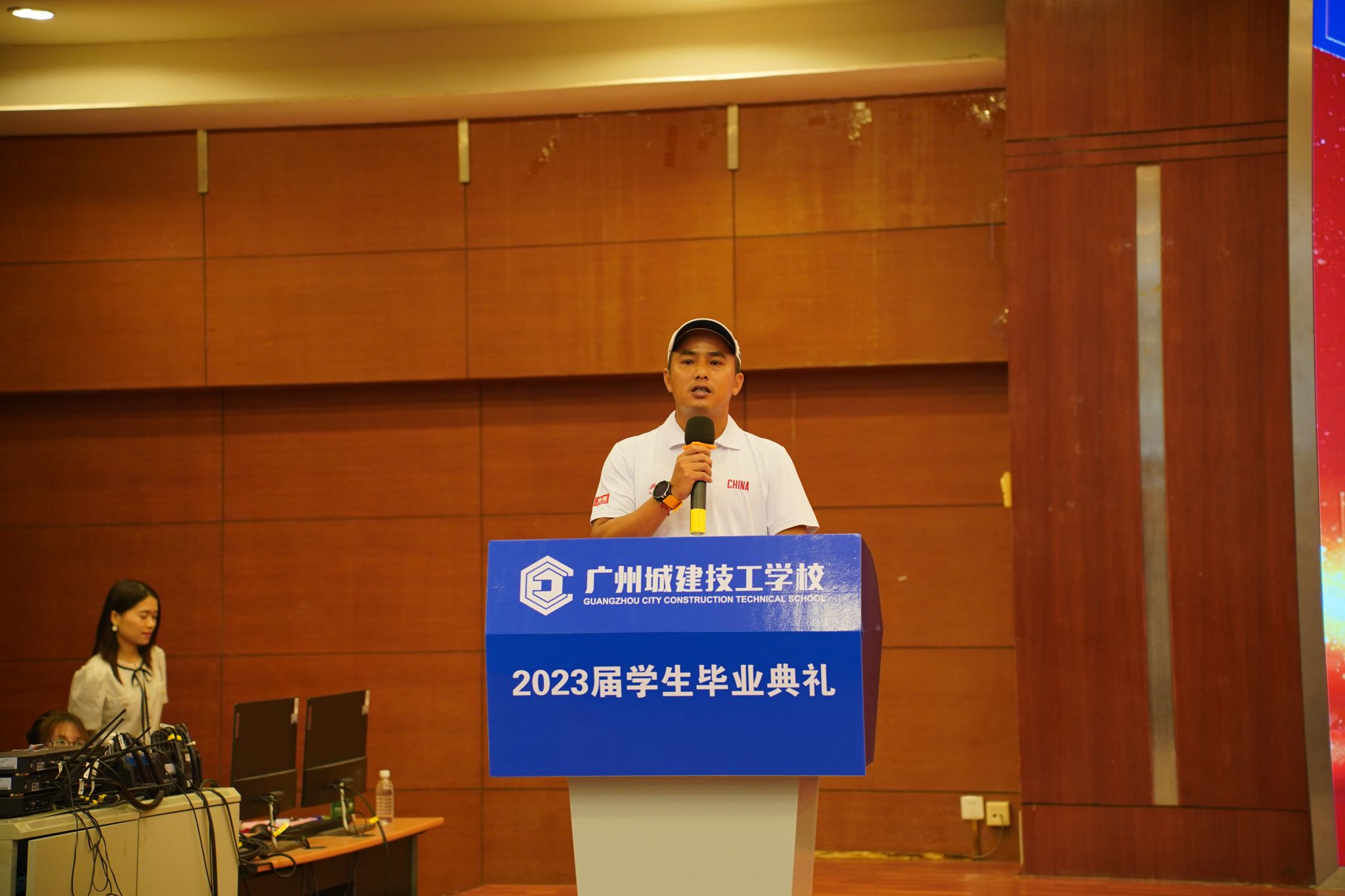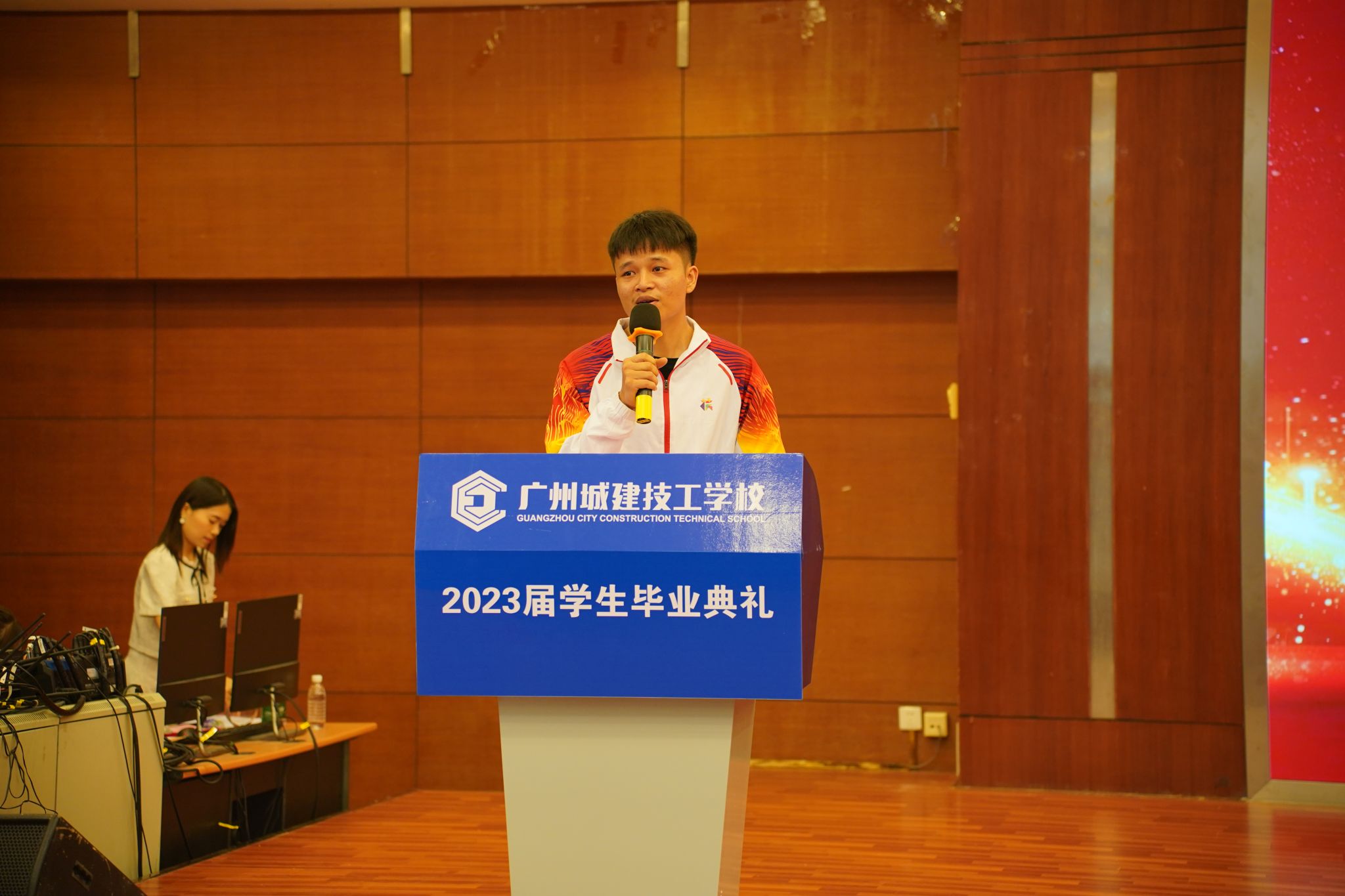 优秀毕业生谢明湛发言,他回顾了在校的学习与生活,代表2023届全体毕业生向辛勤付出的老师表示感谢。也希望各位同学都能做个努力、坚持、勤奋、上进的人。