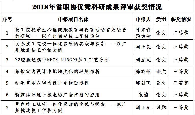 日前,从广东省职业培训和技工教育协会网站发布的文件《关于公布 2018 年度优秀科研成果评审结果的通知》(粤职协〔2019〕5号)获悉,学校获得论文类二等奖1个、三等奖5个,课题类三等奖1个,共7位教师报送的科研成果获奖。