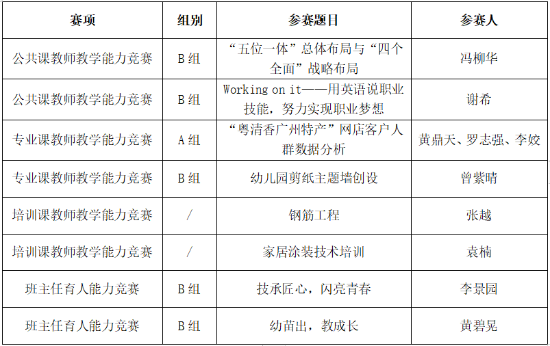 本届大赛由市人力资源社会保障局与市总工会联合举办,由广州市职业技术教育研究院承办,共设置了公共课教师教学能力竞赛、专业课教师教学能力竞赛、培训课教师教学能力竞赛和班主任育人能力竞赛四个赛项及7个组别。我校派出10位教师参与了4个赛项5个组别的角逐。