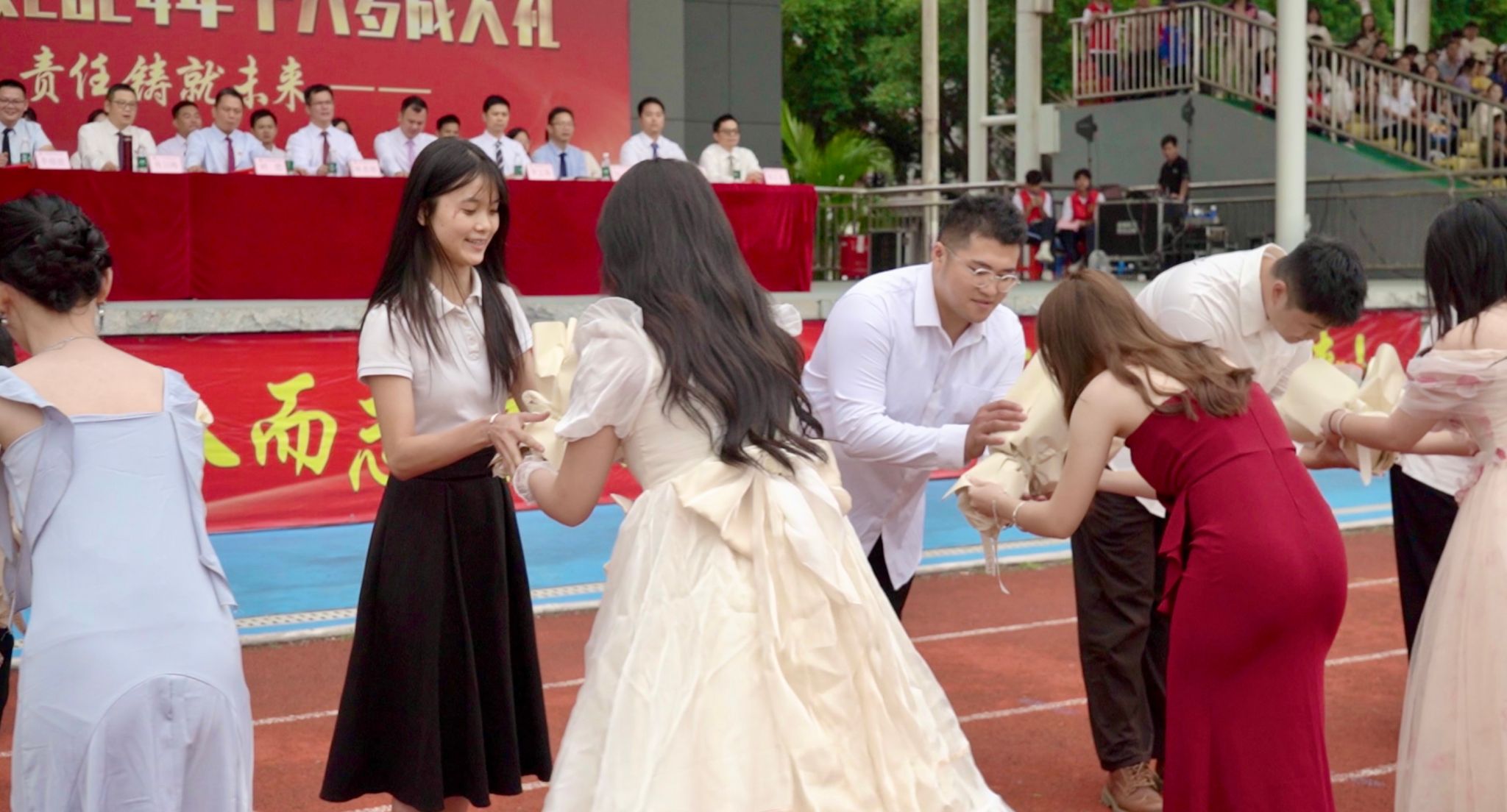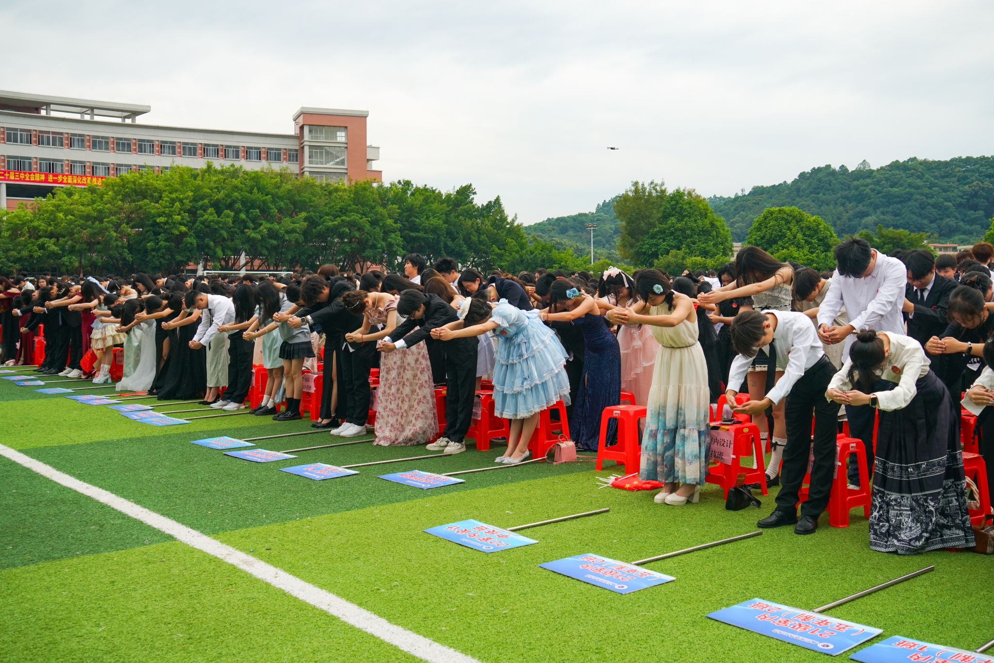 随后,全体同学面向父母、老师行作揖礼,一拜感谢学校鉴我理想,二拜感谢父母养育之恩,三拜感谢老师传道受业解惑。
