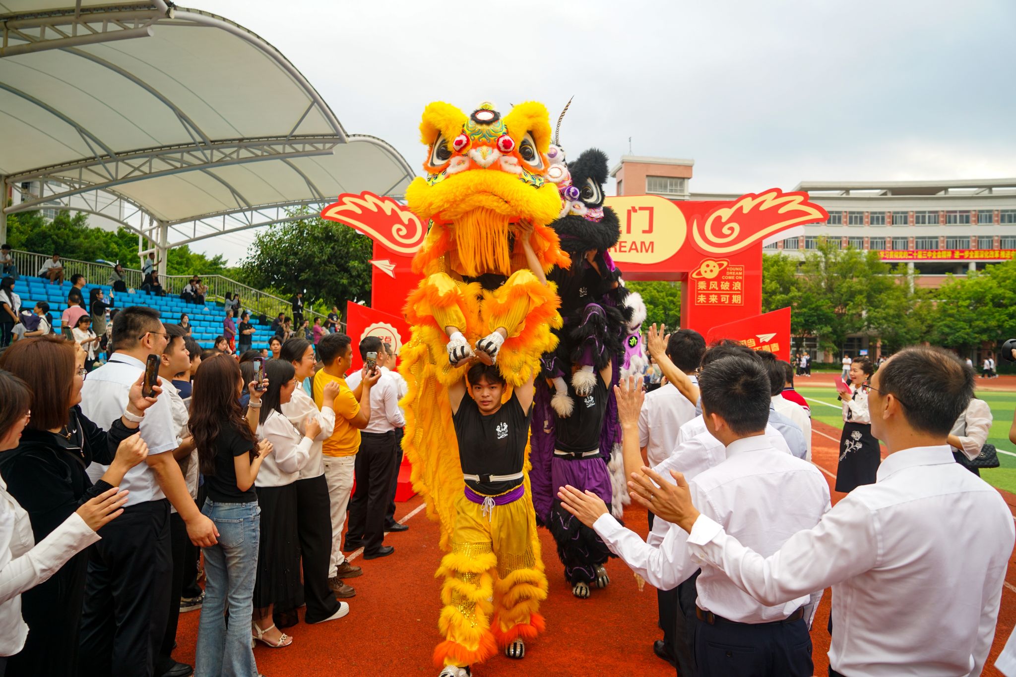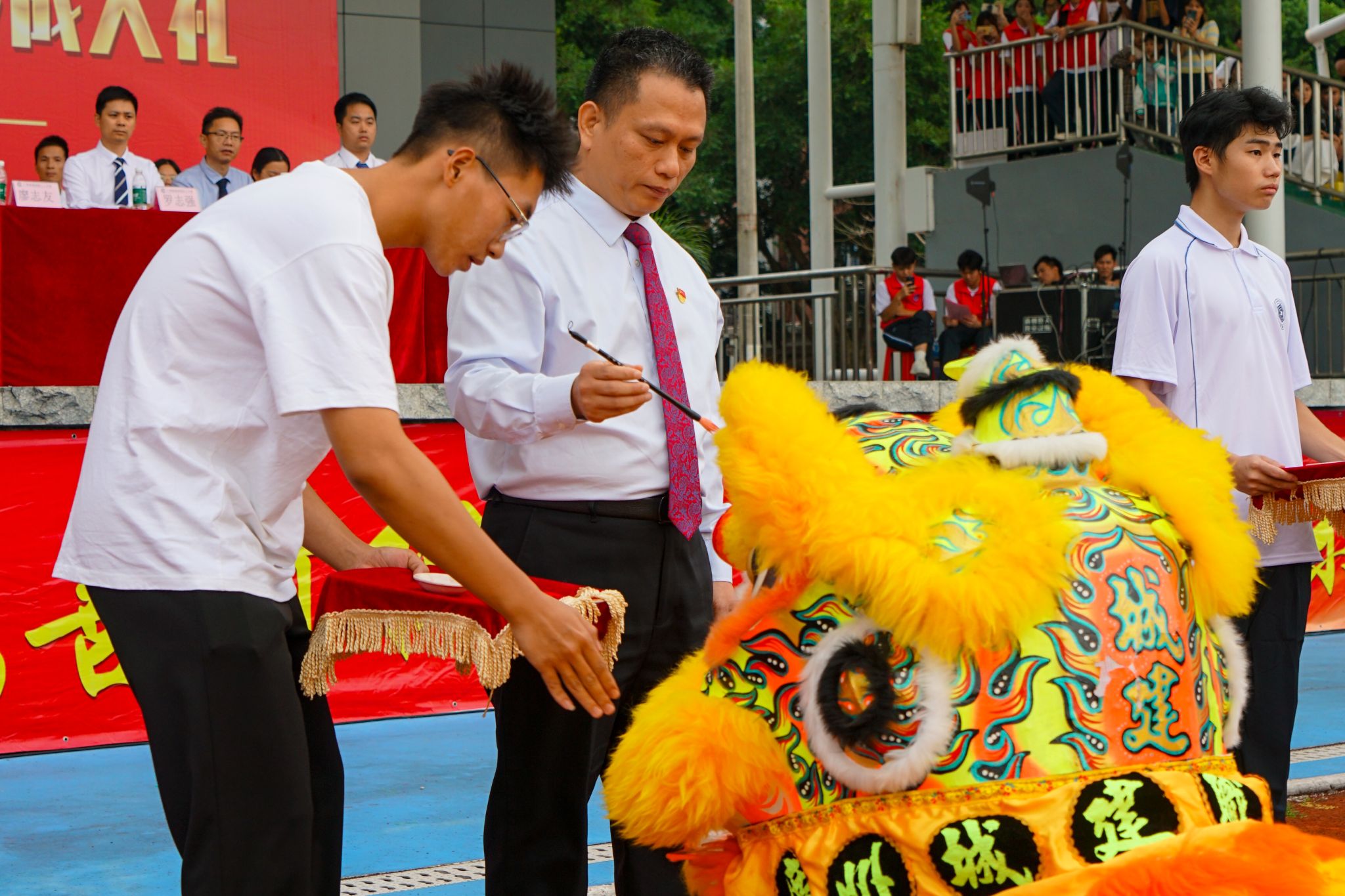 雄壮的鼓声,灵动的狮舞,将中国传统文化的魅力展示得淋漓尽致,瞬间点燃了全体师生的激情,学校领导与学生代表为醒狮点睛,龙狮队为同学们送上真挚的祝福。