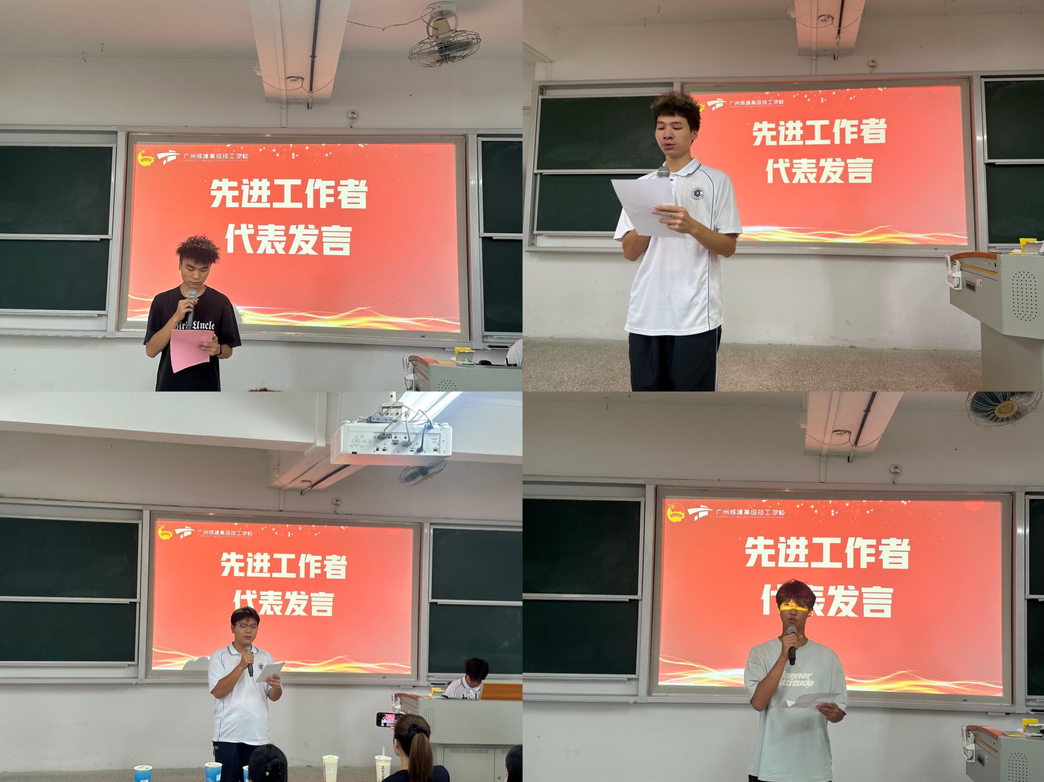 随后,迎新工作先进工作者代表依次上台发言,他们的分享让学生们倍感亲切。李世海同学聚焦团队协作,从迎新现场到军训工作期间,各小组志愿者的配合是迎新顺利推进的关键,自己也在过程中提升了统筹能力量;巫资钧同学分享迎新中陪同行李繁多的新生完成报到、介绍校园的暖心经历,直言在早七晚十的忙碌中体会到工作价值;陈梓杨同学着重谈成长,称与新生及家长的沟通让自己学会换位思考,更懂耐心服务的意义,也深刻认识到迎新是学校传递温暖的窗口;袁泓轩同学以荣誉为鞭策,表示未来将继续投身学生工作,带动更多同学参与校园服务,与新生共促校园发展。四位同学的发言简洁真挚,获现场师生掌声,彰显迎新工作者的责任与活力。