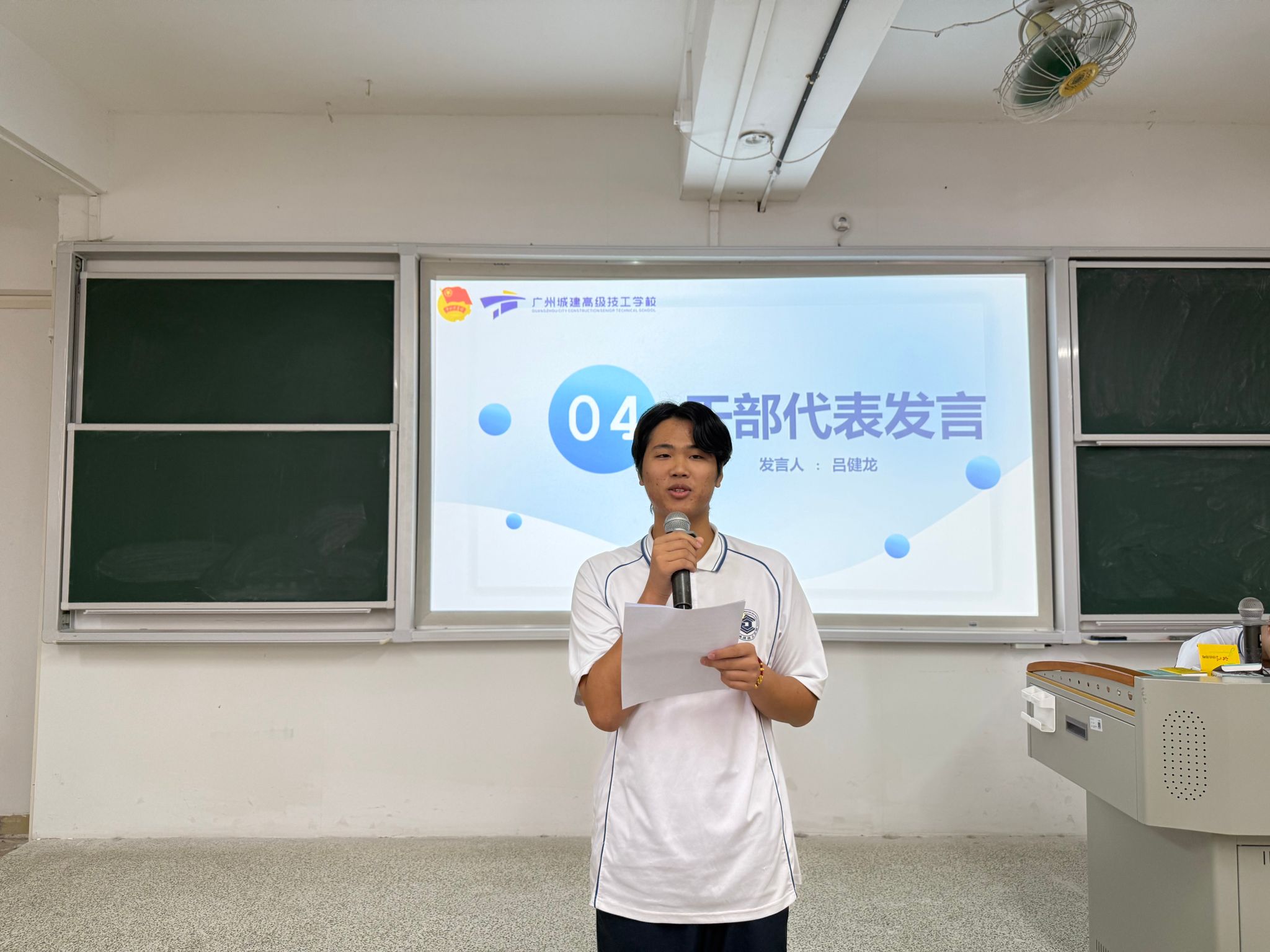 活动接近尾声,团学指导老师胡郸丹上台发言。她首先对2025级新成员的加入表示欢迎,随后结合自身工作经历,鼓励新成员 “多听、多看、多做”,在组织中找准定位,在服务同学的过程中提升能力,“希望大家把团学组织当成第二个家,在这里收获成长与友谊”。