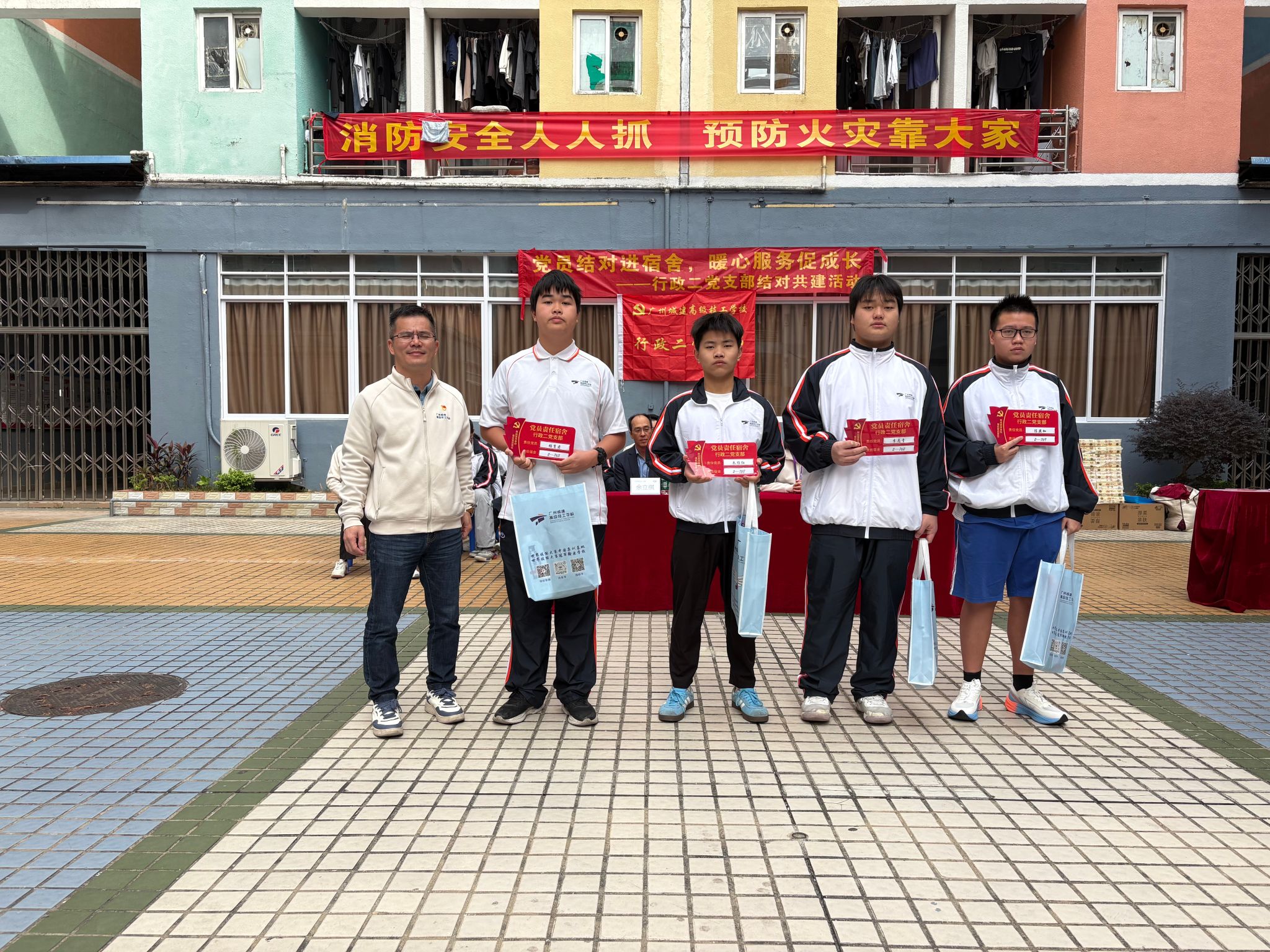 随后,现场举行了简朴而庄重的结对授牌与物资发放仪式。林勇刚副书记为学生宿舍代表授予了“党员联系宿舍”标识牌。对接党员代表向结对学生发放了首批关怀物资。一块标识牌象征着一份公开承诺与责任,一份物资传递着党组织的温暖与问候,标志着党员与宿舍之间常态化、制度化联系渠道的正式建立。