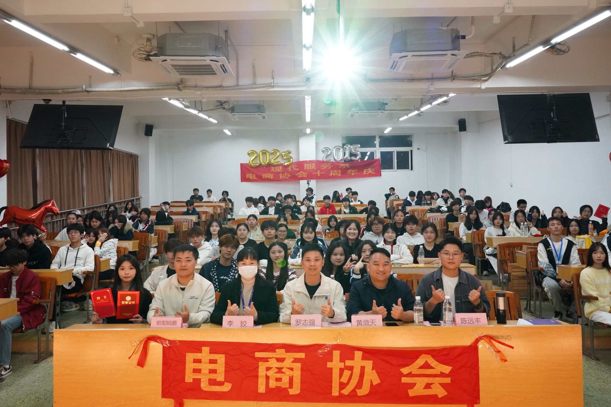 2025年12月4日晚,电商协会十周年庆在人文艺术楼126课室举行。现代服务系主任罗志强、副主任李姣,专业带头人黄鼎天、欧阳锐鹏,以及协会指导老师陈远丰出席活动。2025届协会干部、干事,2025级电商新生与兄弟社团代表共同参与。