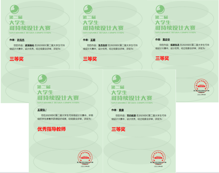 2022-2023学年第二学期,艺术设计系组织了新媒体与互联网应用专业学生参加2023SDC-第二届大学生可持续设计大赛。本次赛事共经历了征稿、评审、复审等环节,我校新媒体与互联网应用专业黄康同学作品《节约能源》、黄亦华同学作品《低碳生活》、王颖同学作品《生态友好》、许元杰同学作品《逐渐融化》在此次赛事中获得了三等奖,艺术设计系王璟怡老师荣获优秀指导老师。