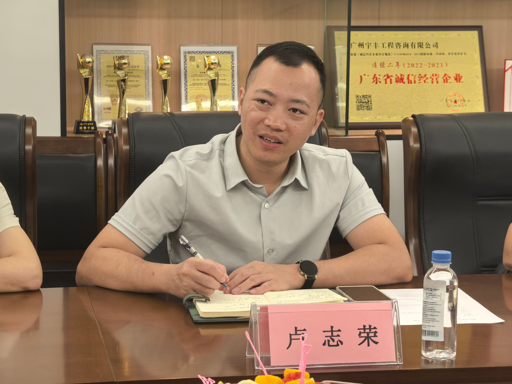 研讨结束后,双方还就实习生培养与管理进行了专题交流。宇丰集团咨询公司造价部张荣光经理对两位在岗实习生朱荣艳、黎芷郗的学习态度与专业表现给予充分肯定,校企导师共同关注学生成长,体现出“协同育人、共促成长”的良好氛围。随后,参会人员一行参观了集团总部办公区与项目管理部门,直观感受企业运作流程与管理文化。