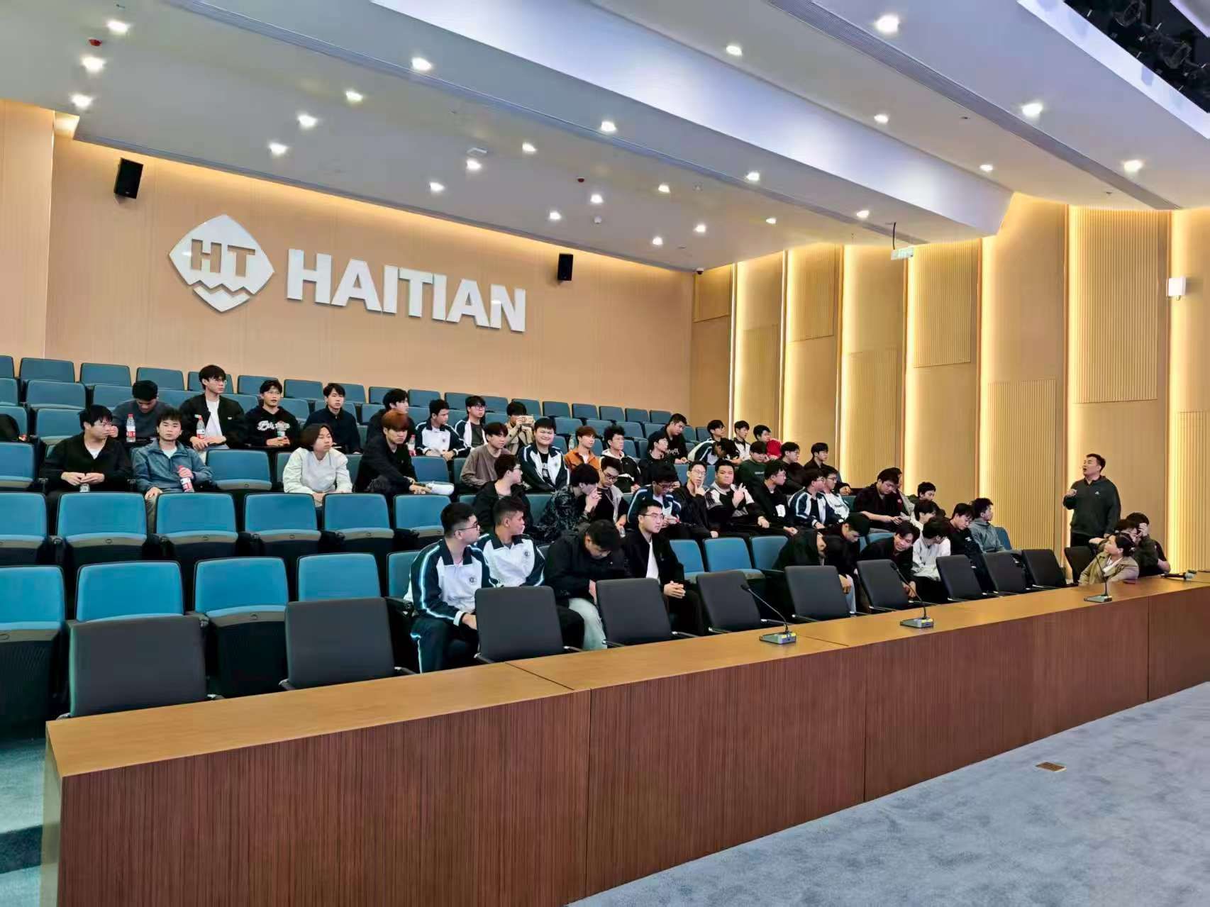 活动期间,同学们乘坐厂区观光车,依次参观了一车间(外协配套综合车间)、二车间(关键部件组装车间)及小型机组装车间、AGV总装流水线等。现场直观的生产场景让同学们印象深刻,海天精工成熟的生产总线体系,搭配AGV智能运输、无人值守传送带、机器人喷涂等先进制造系统,全方位展现了现代制造业的技术高度。