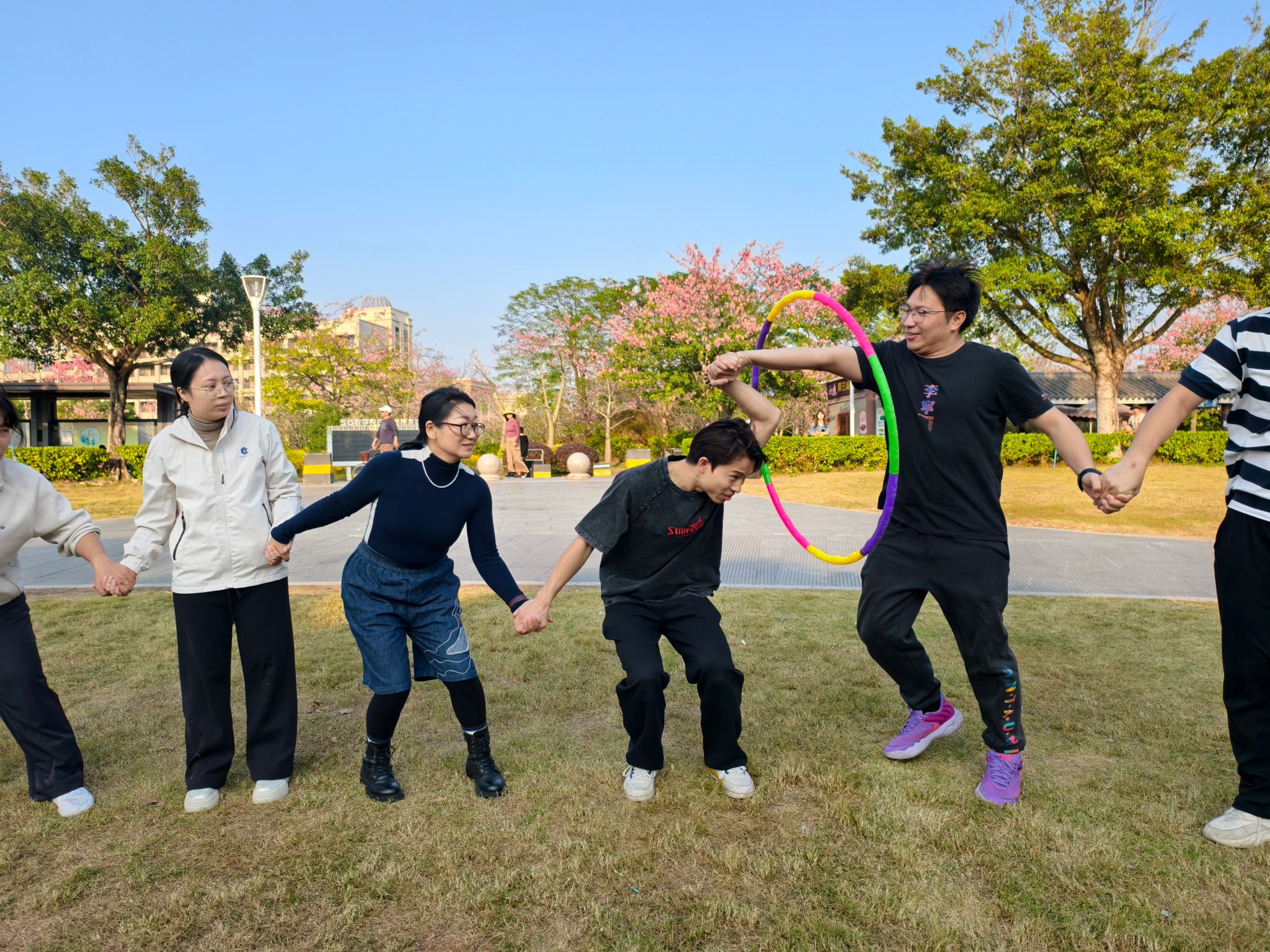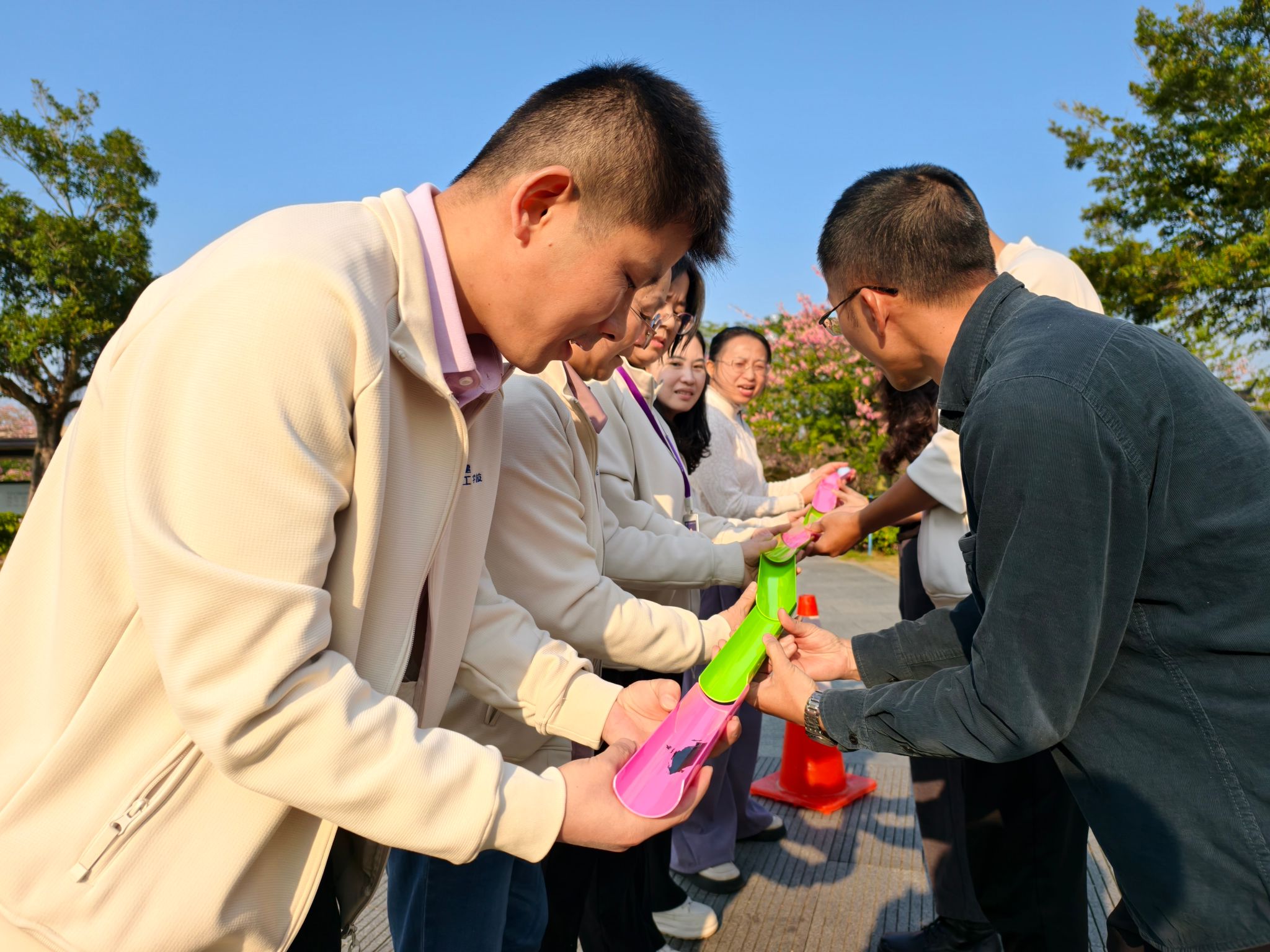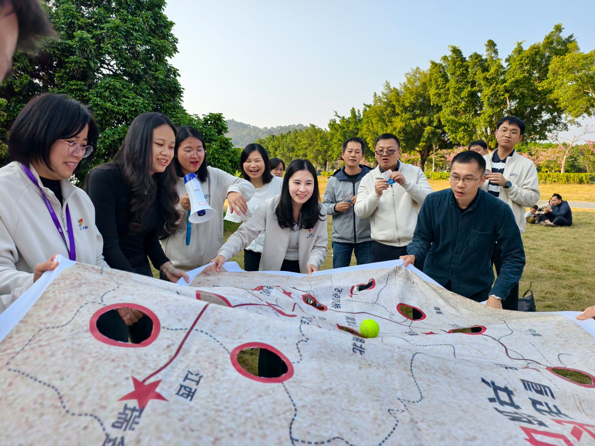 爬山活动结束后,教师们移步风云岭草坪,参与工会小组精心设计的团建游戏环节。重走长征路、珠行万里、薪火相传,神投手等趣味项目依次开展。各队伍默契配合、争分夺秒,精准衔接的动作尽显匠心协作本色,草坪上呐喊声与欢笑声交织,团队凝聚力在游戏中持续升温。