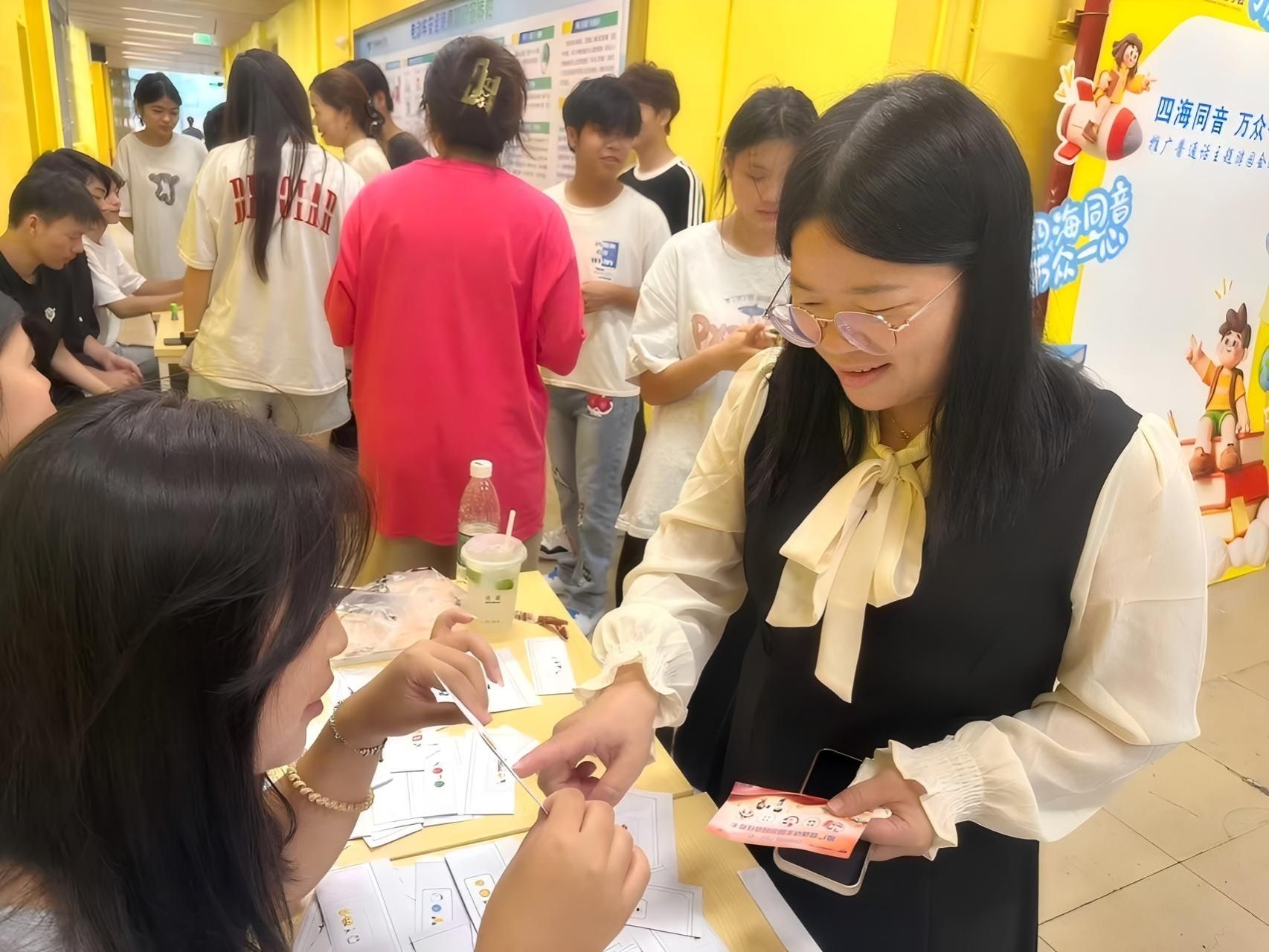 现场气氛热烈,师生们手持闯关卡参与游戏,集章兑换奖品。合影墙前也排起长队,大家手持“今天我说普通话啦!”标语拍照并分享至社交平台,扩大了活动影响。