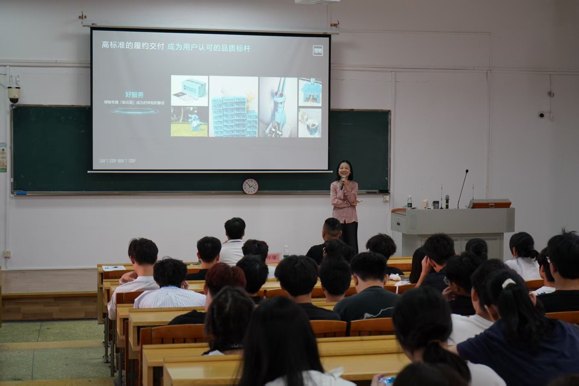 在主题讲座中,得物政企合作发展部高级经理孙璟以“潮流电商运营实战”为题,深入解析了得物平台“内容+交易”的创新模式,以及“先鉴别,后发货”的品控体系。通过丰富的案例,详细介绍了得物“2025造浪计划”中关于品牌培育、爆品挖掘及潮流文化推广的战略布局,为师生呈现了一幅完整的电商行业全链路运营图景。