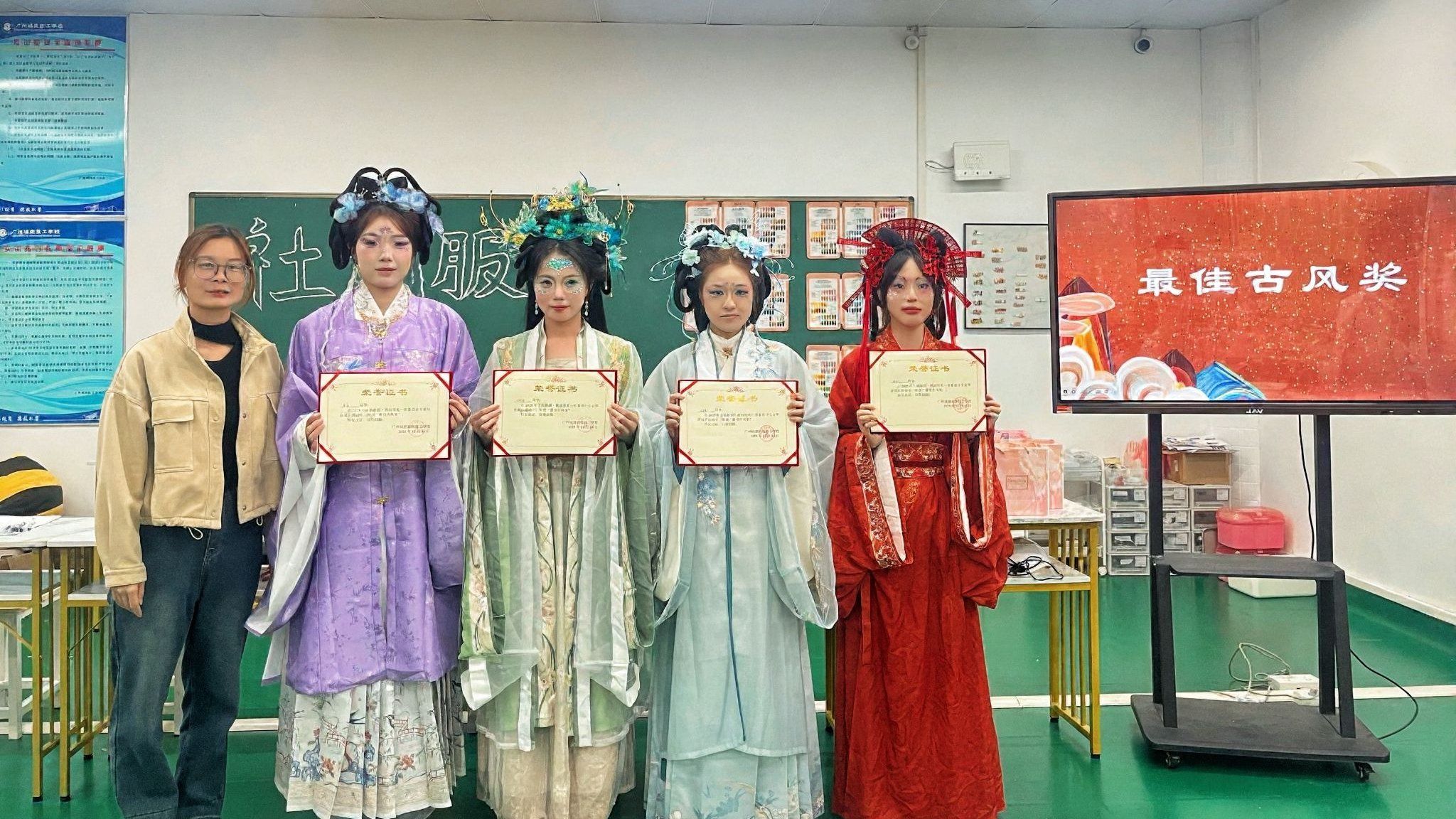 本次展示特邀广州金夫人婚纱艺术摄影有限公司化妆总监李洁霞、从化区高级化妆师邓其隆以及形象设计与健康管理专业教师陈清清、刘丹娜、黄彩怡等担任评委。评审从“妆容设计”“造型设计”“整体表现与创意”三大维度进行综合考评,注重技艺表现与文化内涵的统一。最终,评选出“最佳古风奖”四名、“最佳创意奖”三名、“优秀奖”三名,并为获奖学生颁发荣誉证书与奖品。