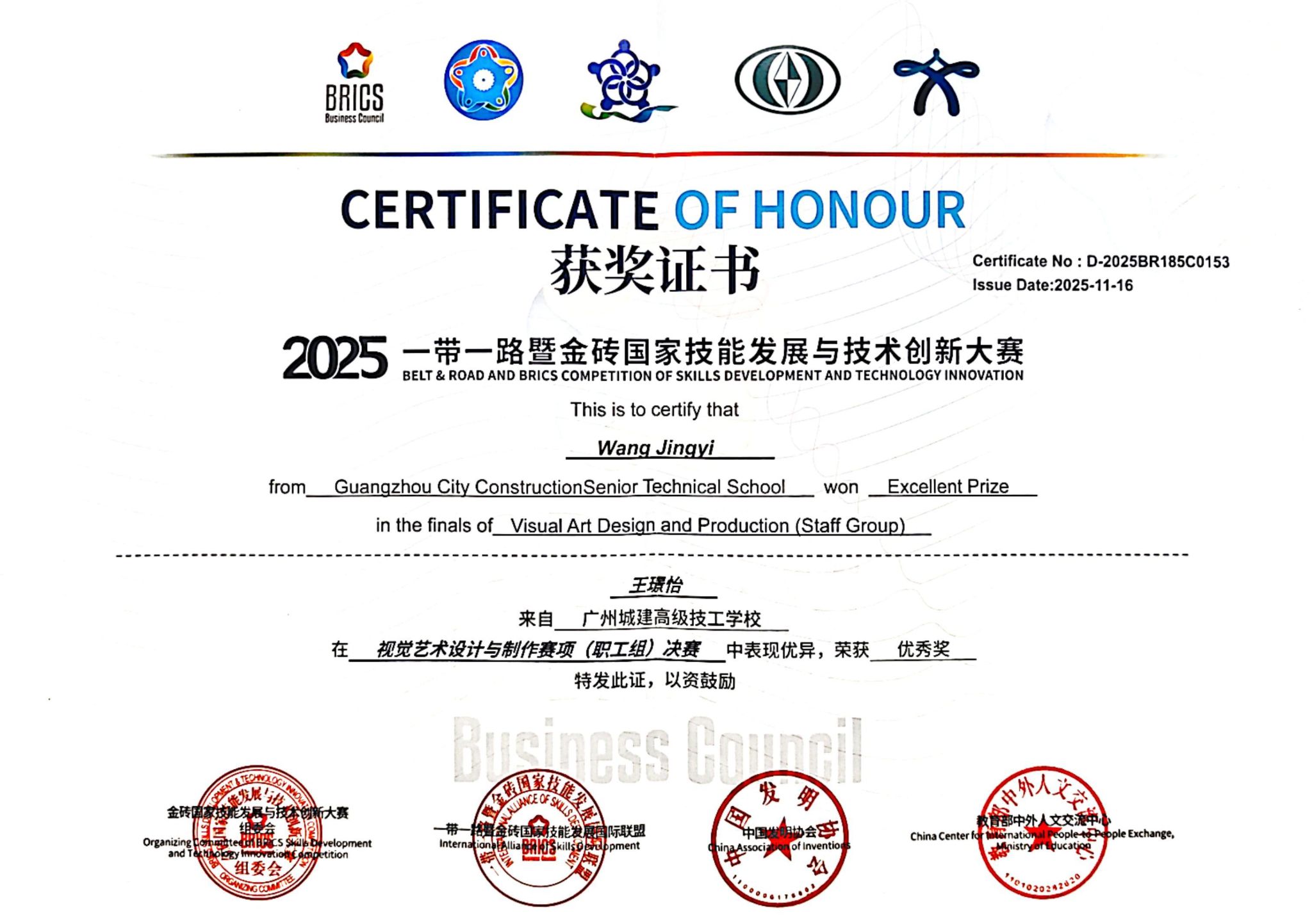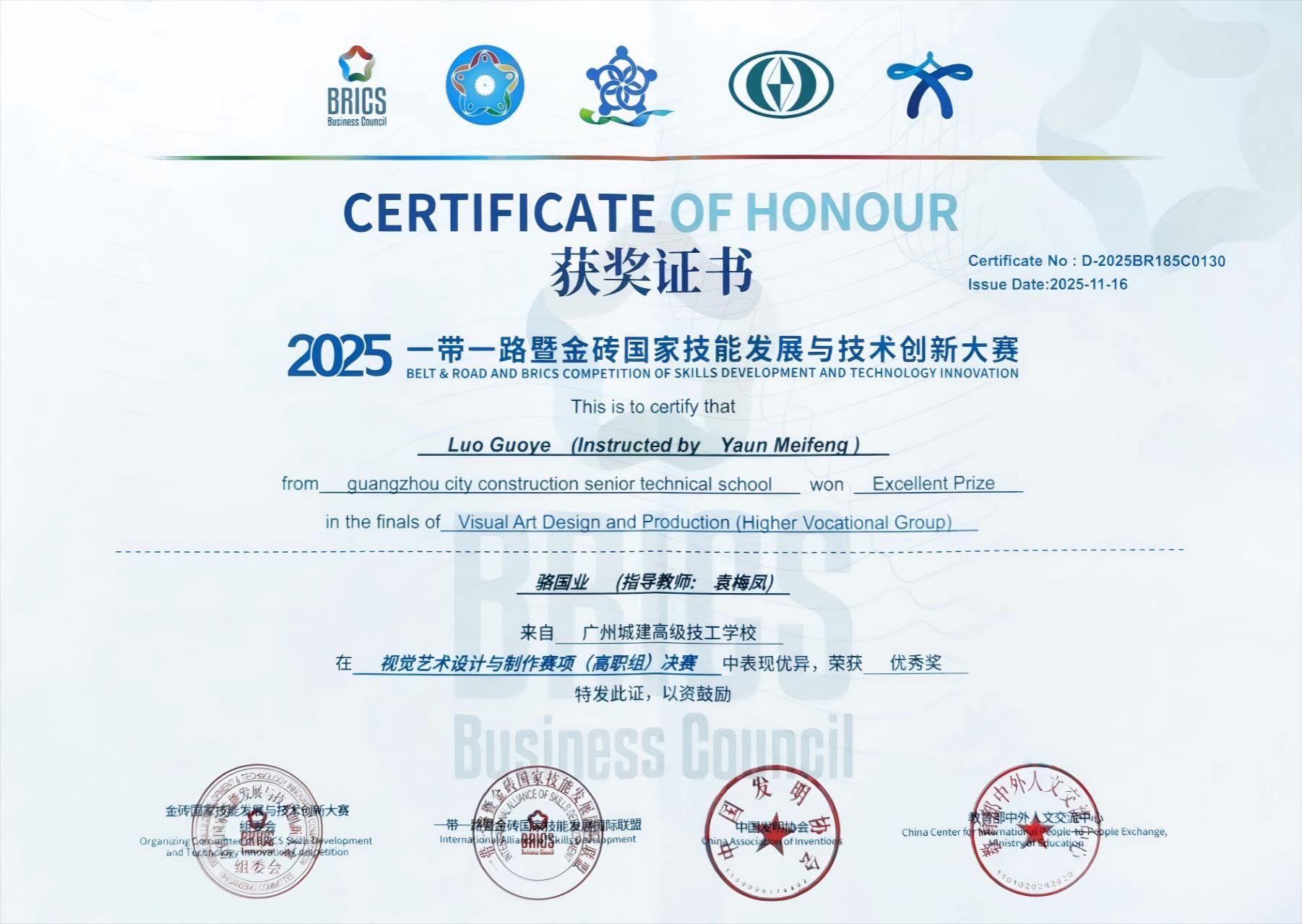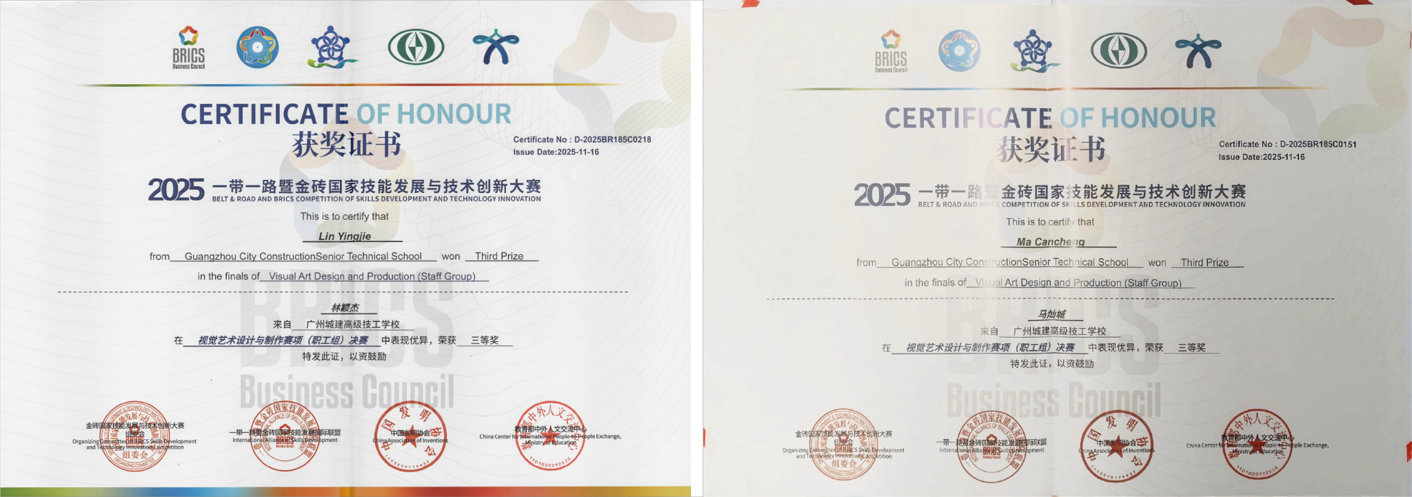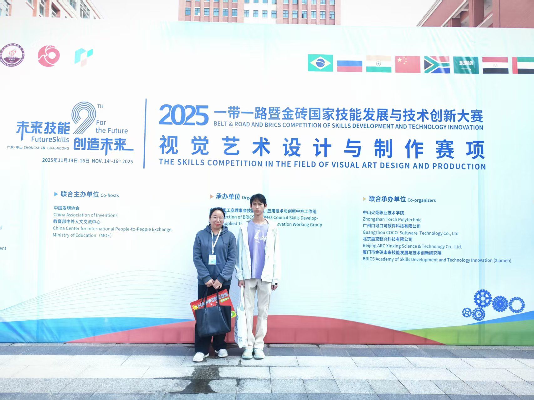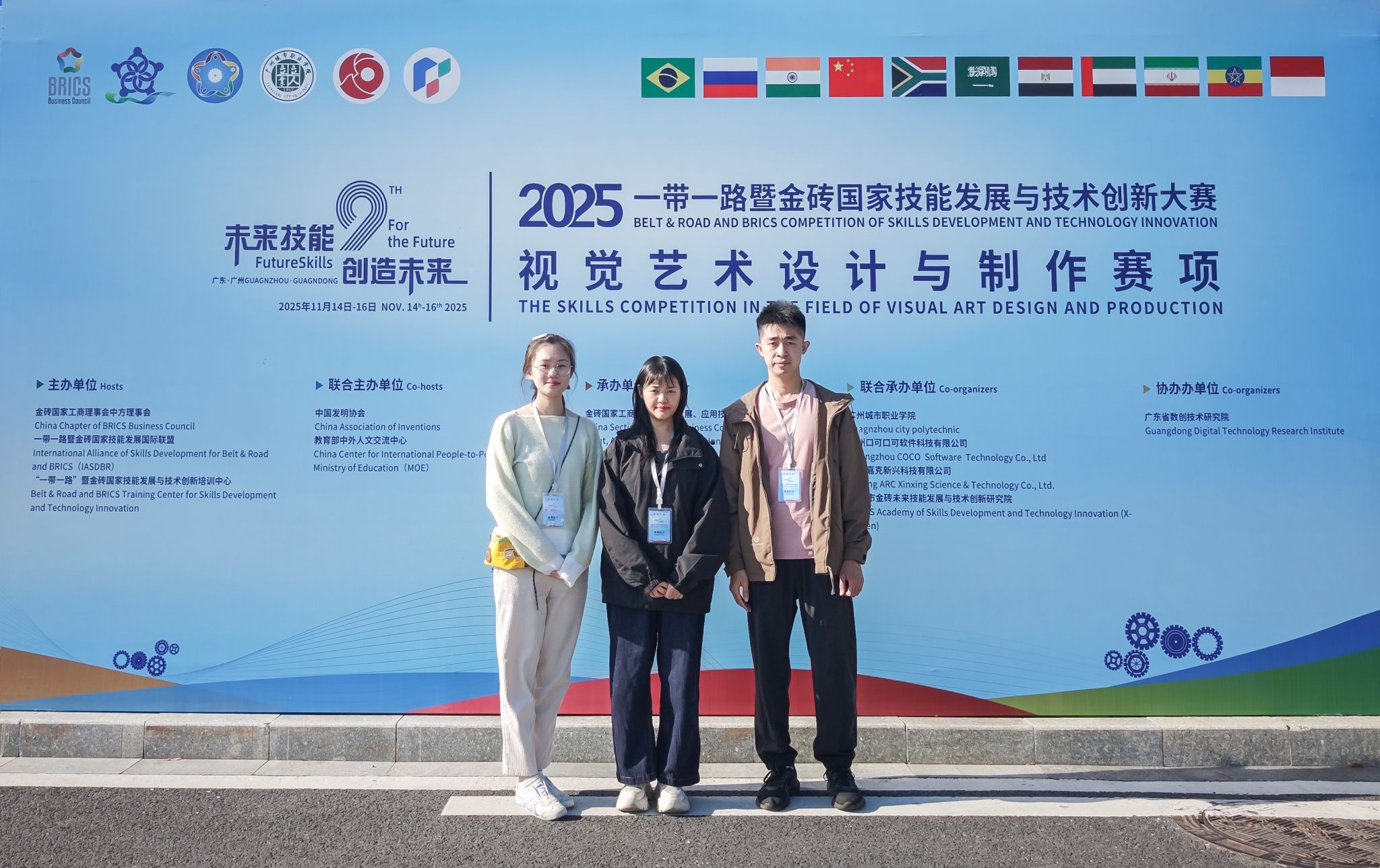 2025“一带一路”暨金砖国家技能发展与技术创新大赛“视觉艺术设计与制作赛项”高职组决赛在中山火炬职业技术学院、职工组在广州城市职业学院圆满举行。作为金砖国家最高领导人会晤认可、外交部备案的国际赛事,该大赛已成功举办八届,累计45万余人次参与,是推动金砖国家技能人才培养、教育对外开放的重要平台。数字技术系师生积极参赛,在激烈角逐中脱颖而出,斩获多项荣誉。