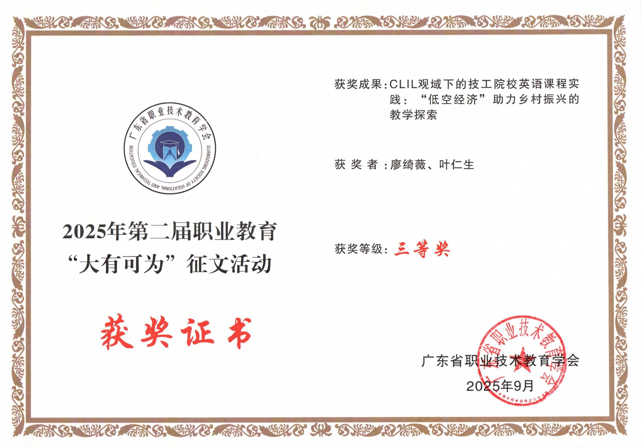 廖绮薇、叶仁生两位教师联合撰写的论文《CLIL观域下的技工院校英语课程实践:“低空经济”助力乡村振兴的教学探索》,聚焦职教发展关键议题,逻辑严谨、观点鲜明,斩获三等奖。