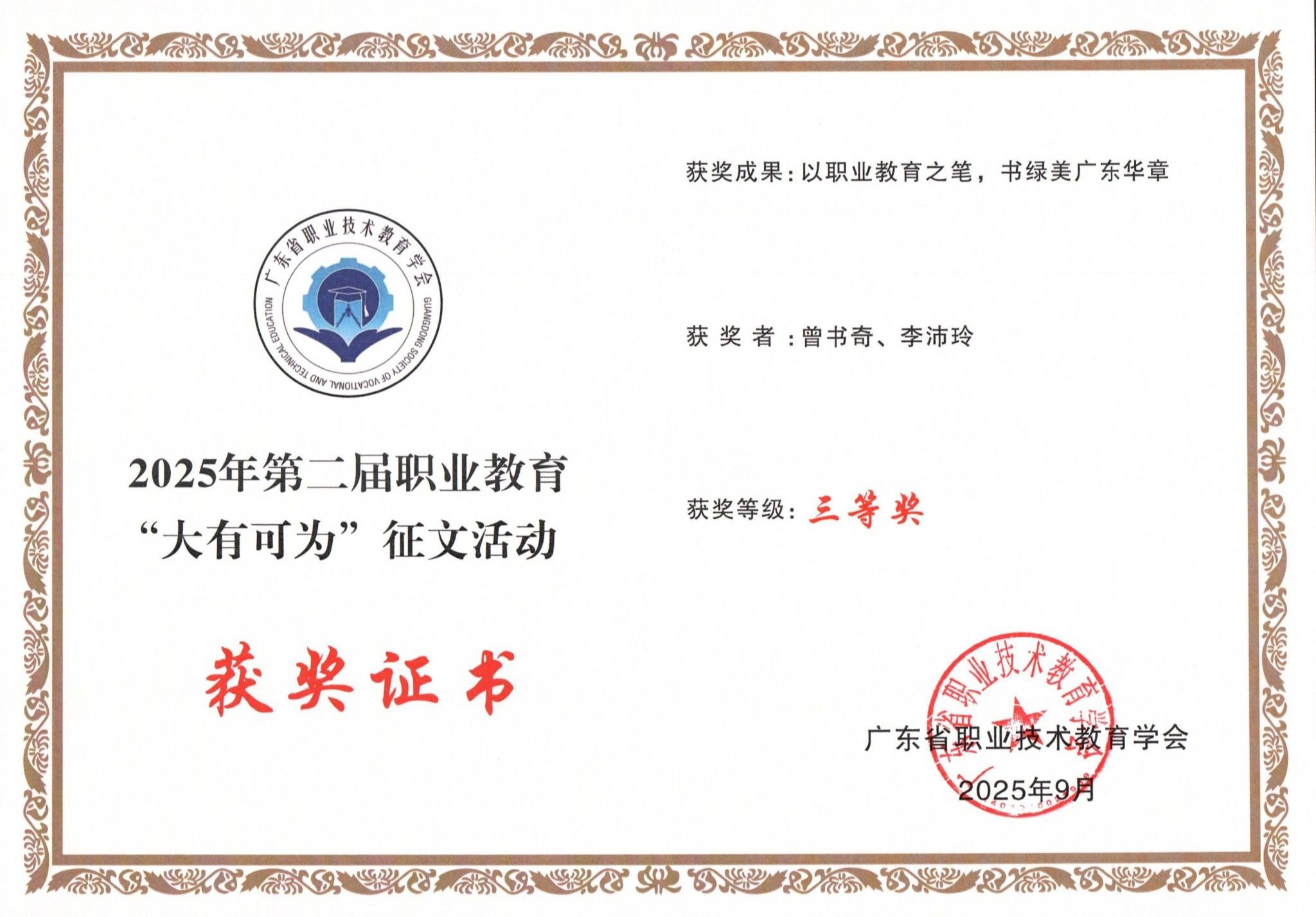 近日,广东省职业技术教育学会公布2025年第二届职业教育 “大有可为”征文活动获奖名单,我校教师在全省多单位、多作品的激烈角逐中脱颖而出,斩获多项荣誉,彰显我校职教研究与育人实力!