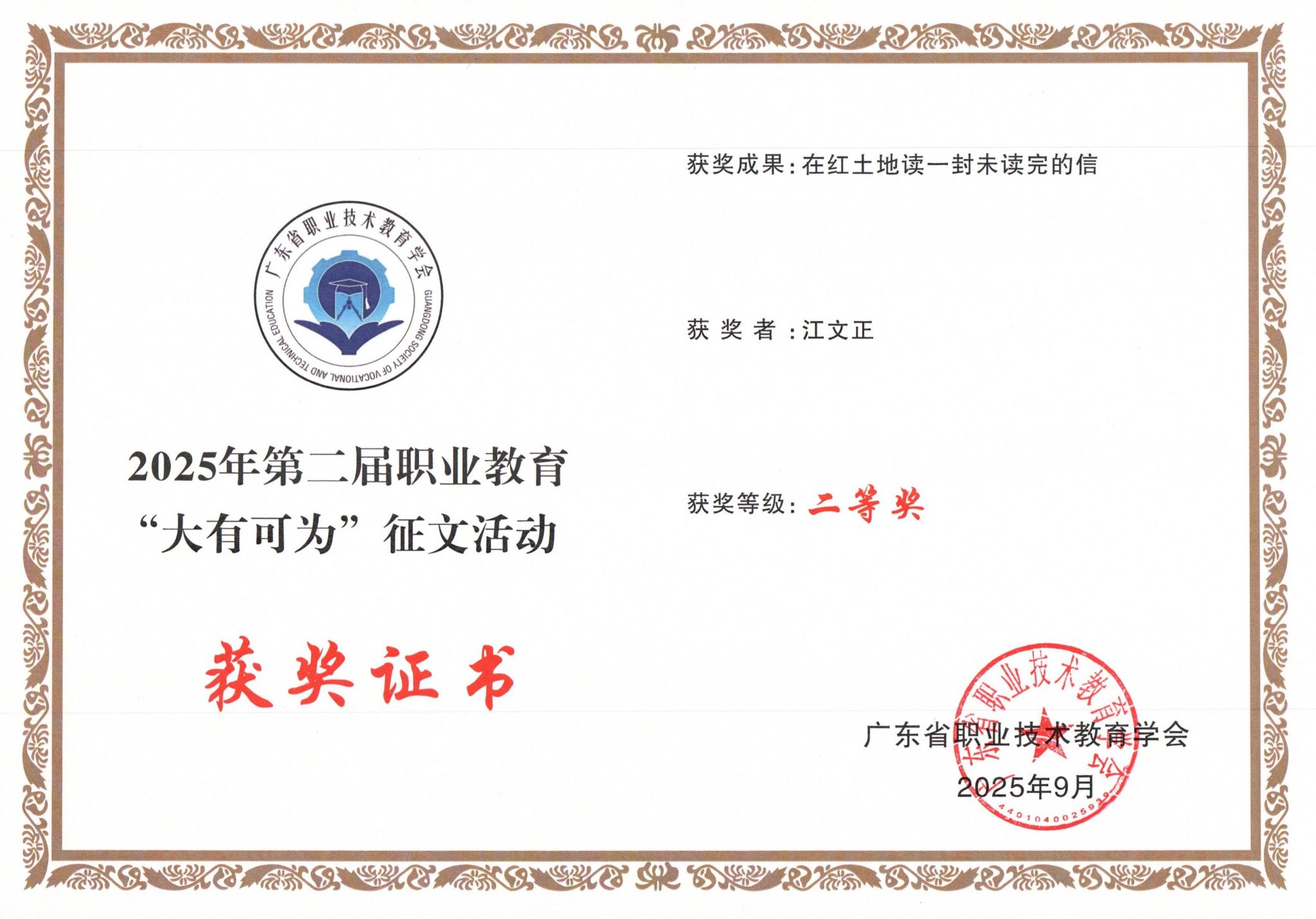 本次活动中,我校成果丰硕。其中,曾书奇、李沛玲两位教师携手指导江文正同学创作的小说《在红土地读一封未读完的信》,凭借生动的职教故事与深刻的育人思考荣获二等奖,两位指导教师获“优秀指导老师”荣誉称号。