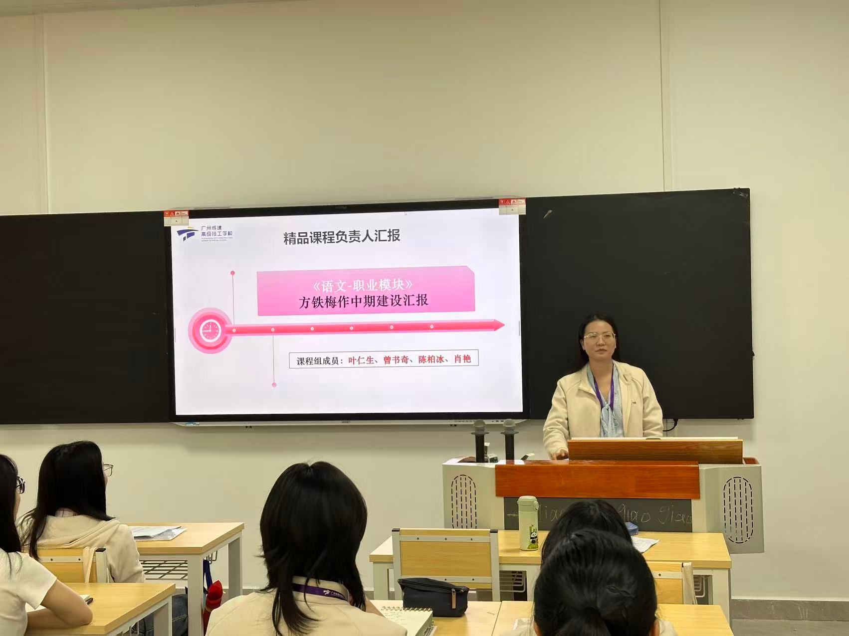 随后,两项精品课程负责人依次进行中期建设汇报。语文(职业模块)精品课程负责人方铁梅老师从课程作用、学习目标与内容、建设目标与预期成果、现有资源、建设困境及改进方向六大维度展开汇报。她指出,该课程以“促多元发展与价值涵养”为核心,通过语文教学弘扬社会主义核心价值观、坚定学生文化自信、涵养职业精神,实现“知识传授+价值引领”双重目标;学习内容紧扣职业需求,涵盖劳模精神研读、职场应用写作、微写作等模块,凸显职教特色与实践导向。目前课程已完成教材初稿、课件、考核资料及部分教学视频等核心资源积累,但仍面临学生实践少、竞赛成果不足、职业特色需进一步强化等问题。后续将以“注重实践,发挥语文实用性”为目标,通过强化实践设计、推动校企合作、组织竞赛参与,助力学生职业生涯发展。