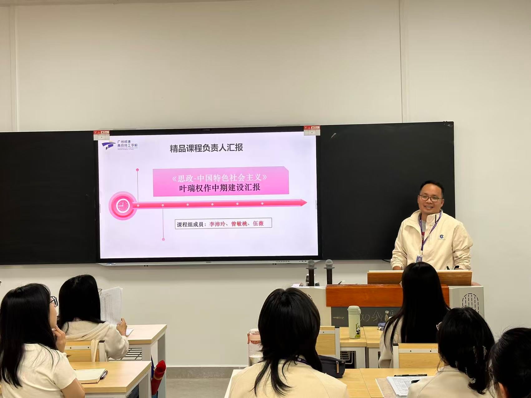 思政(中国特色社会主义)精品课程负责人叶瑞权老师则围绕“设计-实施-师资-效果-规划”五大维度系统汇报。他强调,思政课程作为落实立德树人根本任务的关键课程,采用“课堂讲授+案例研讨+实践体验”的教学模式,聚焦“引导学生树立正确政治方向”,培养学生政治认同与家国情怀。课程以“五位一体”总体布局为核心设计教学内容,结合时政热点更新案例,采用自主学习法、时事案例分析法等提升教学针对性;已建成教材、网络资源、实践基地等资源体系,未来将通过优化师资团队、以赛促教、拓展实践基地、整合数字化资源,进一步提升课程质量与育人实效。